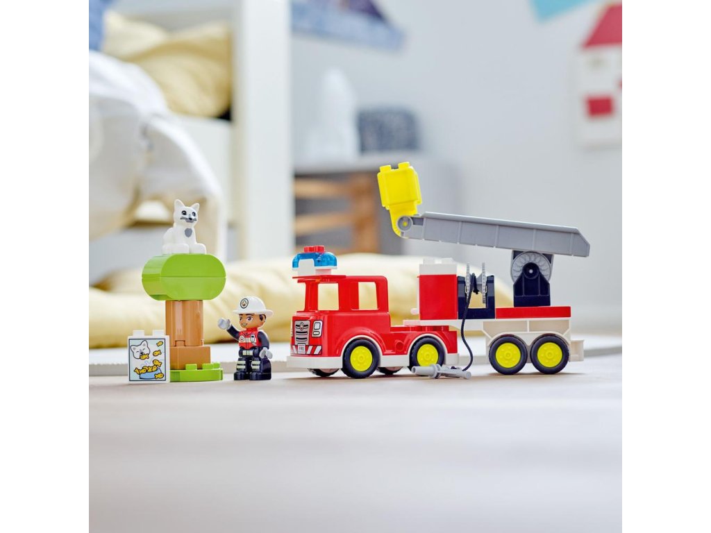 Deti od 2 rokov, ktoré fascinujú hasičské autá, ostanú bez slov zo setu LEGO® DUPLO® (10969) Hasičské auto. Záchrana zvierat s hasičským autom V korune vysokého stromu uviazla mačka! Na scénu prichádza hasičské auto so žiarivými svetlami a zvučnou sirénou (batérie sú súčasťou balenia). Vaši malí hrdinovia môžu zatlačiť a pootočiť páčkou auta, vysunúť tak rebrík a vyklopiť kôš. Ak však mačička odmieta nastúpiť, skúste je prilákať lahodnými dobrotami. A ak nefunguje ani to, je čas vytiahnuť hasičskú hadicu! Vďaka rozkošnému zvieratku, ktoré treba zachrániť, a milému hasičovi vo funkciami nabitom hasičskom aute táto praktická stavebnica rozvíja sociálne, emocionálne a jemné motorické zručnosti detí prostredníctvom hier na realistické dobrodružstvá hrdinov všedných dní. Škola hrou pre najmenších Hračky LEGO DUPLO deťom vkladajú do rúk zábavu bez hraníc, možnosti sebavyjadrenia a hravého sk�
