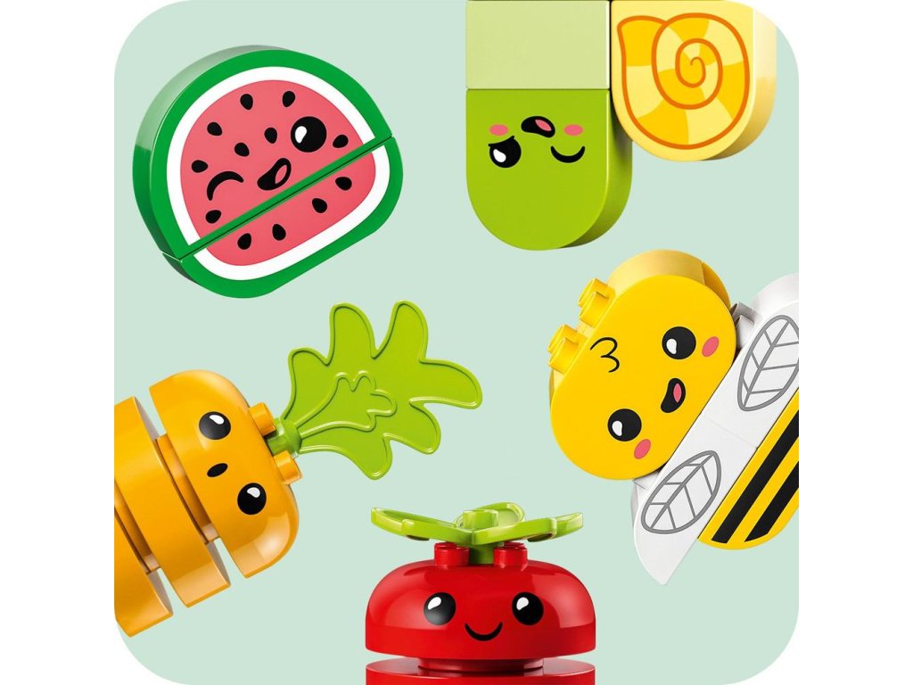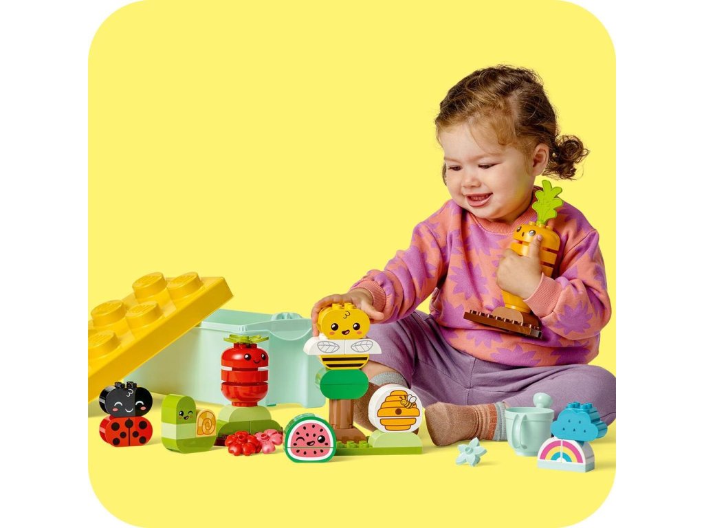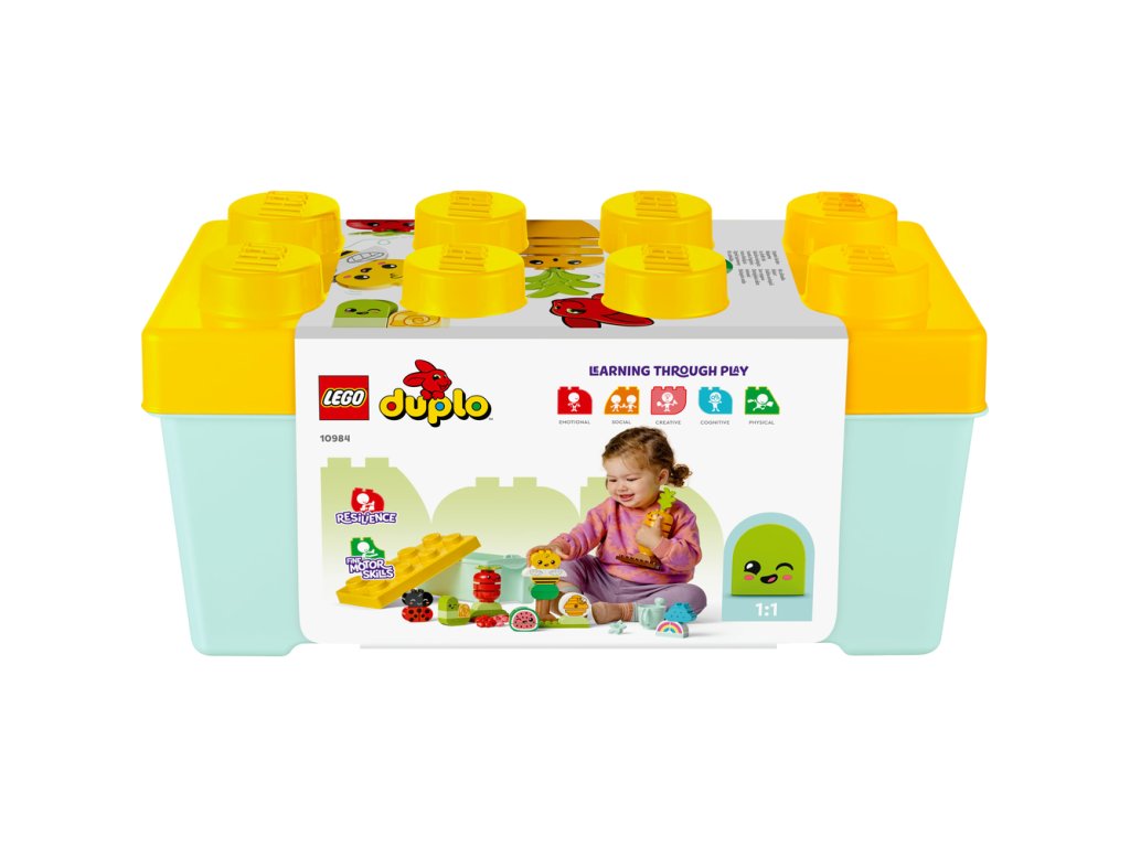 So stavebnicou LEGO® DUPLO® Moja prvá bio záhradka (10984) sa váš drobec môže ponoriť do lona prírody. Je plná rôznych funkcií, ktoré rodičom pomôžu nadviazať rozhovor s deťmi o tom, čo rastie v záhrade a čo je to ekosystém. Drobné rúčky môžu preskúmať paradajku, mrkvu, melón, stromy, kvety, zvieratá a kocky s počasím. A keď sa hra skončí, môžu všetko zasa pekne uložiť do boxu na kocky LEGO DUPLO. Hračky na rozvoj vzdelania detí Stavebnice LEGO DUPLO Moje prvé ponúkajú nekonečné príležitosti na vzdelávanie plné nápadov a hier. Táto praktická stavebnica naučí batoľatá viac o tom, ako rastie ovocie a zelenina vďaka skladaniu prvkov rozvíjajúcich jemnú motoriku. Rastliny majú rozkošné tváričky, s ktorými môžu deti vyjadriť svoju individualitu, oceniť rôznorodosť a prežívať chvíle tvorivej zábavy s rozkošnými potravinovými postavičkami.