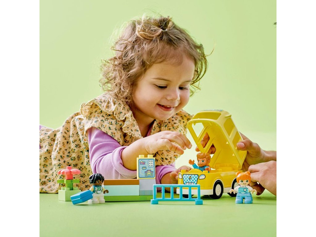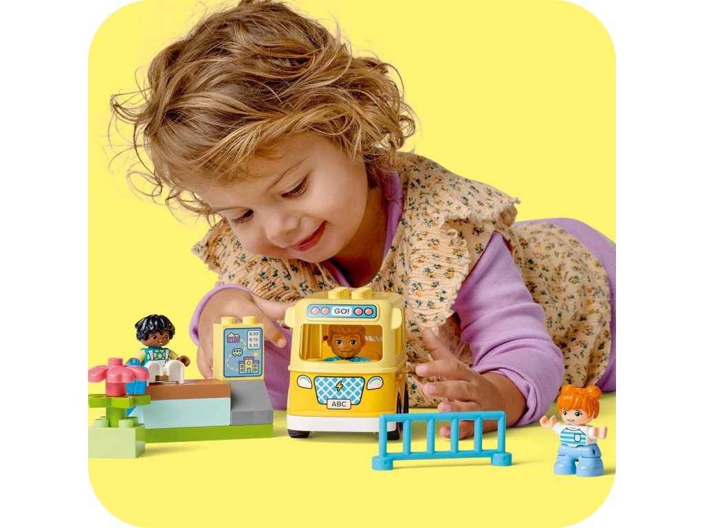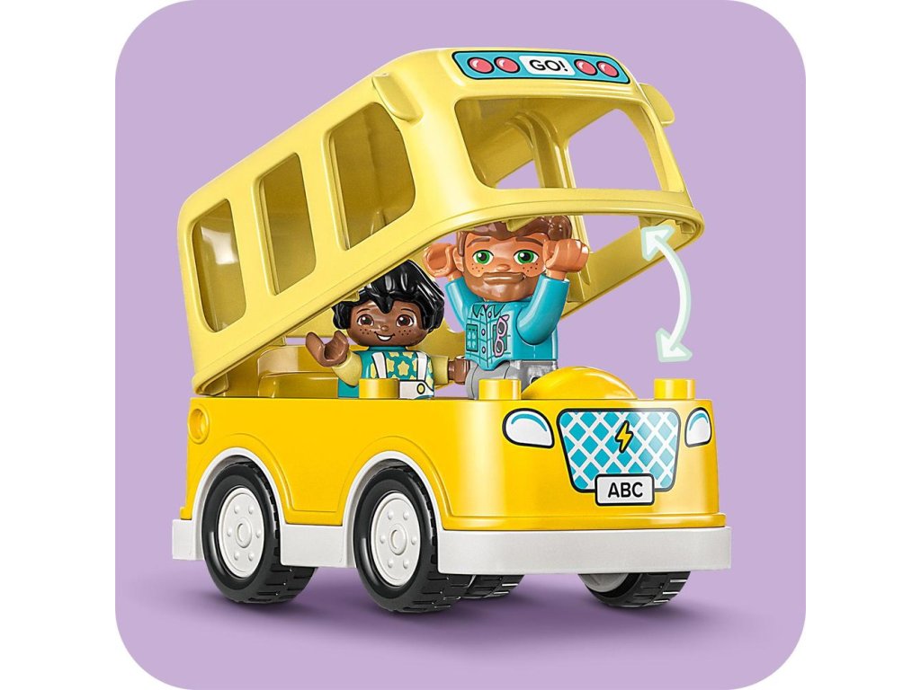 Najmenší stavitelia zažijú s touto stavebnicou LEGO® DUPLO® Mesto Jazda autobusom (10988) každodenné dobrodružstvo. Táto farebná stavebnica pre batoľatá umožní deťom od 2 rokov zahrať sa na cestu do škôlky so svojimi najlepšími kamarátmi. Deti si môžu vyskúšať, aké je to trpezlivo čakať na autobus na hračkárskej lavičke na zastávke a pozrieť sa, aké chutné dobroty ich čakajú v obedári. Zábavné vzdelávacie hračky pre najmenších Stavebnice LEGO DUPLO obsahujú rôzne postavičky, takže malé deti si môžu nájsť nových hračkárskych kamarátov. Počas otvárania odnímateľnej strechy autobusu a ukladaní postavičiek dovnútra si deti rozvinú zručnosti jemnej motoriky. Autobus práve zastavil na zastávke a figúrky už čakajú za plotom, takže deti sa môžu naučiť, ako sa správať v premávke. Rovnako ako všetky hračky LEGO DUPLO pre batoľatá, aj táto súprava dá do rúk najmenších detí zábavu s otvoreným koncom,