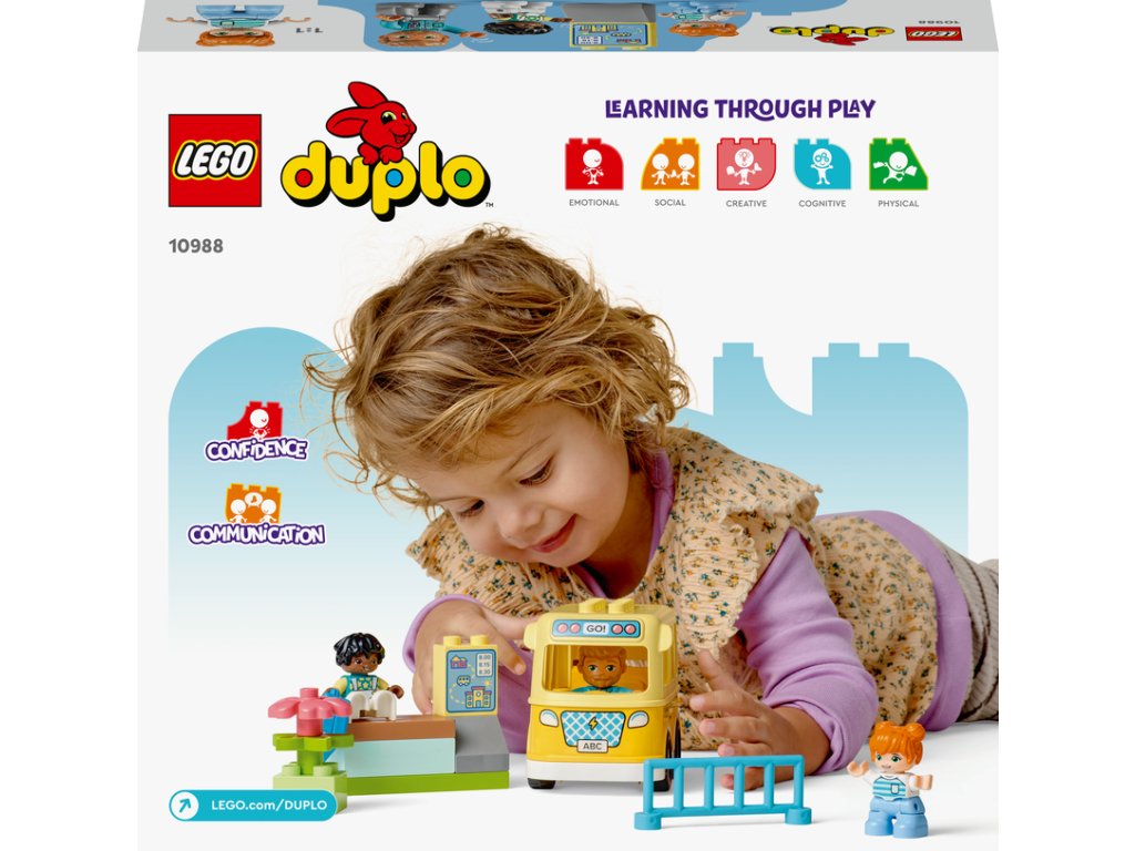 - Hračkársky školský autobus, ktorý rozvíja zručnosti – Batoľatá od 2 rokov sa vyberá na každodenné dobrodružstvo a rozvinie svoje sociálne aj jemné motorické zručnosti s hračkárskym modelom LEGO® DUPLO® Jazda autobusom (10988)
