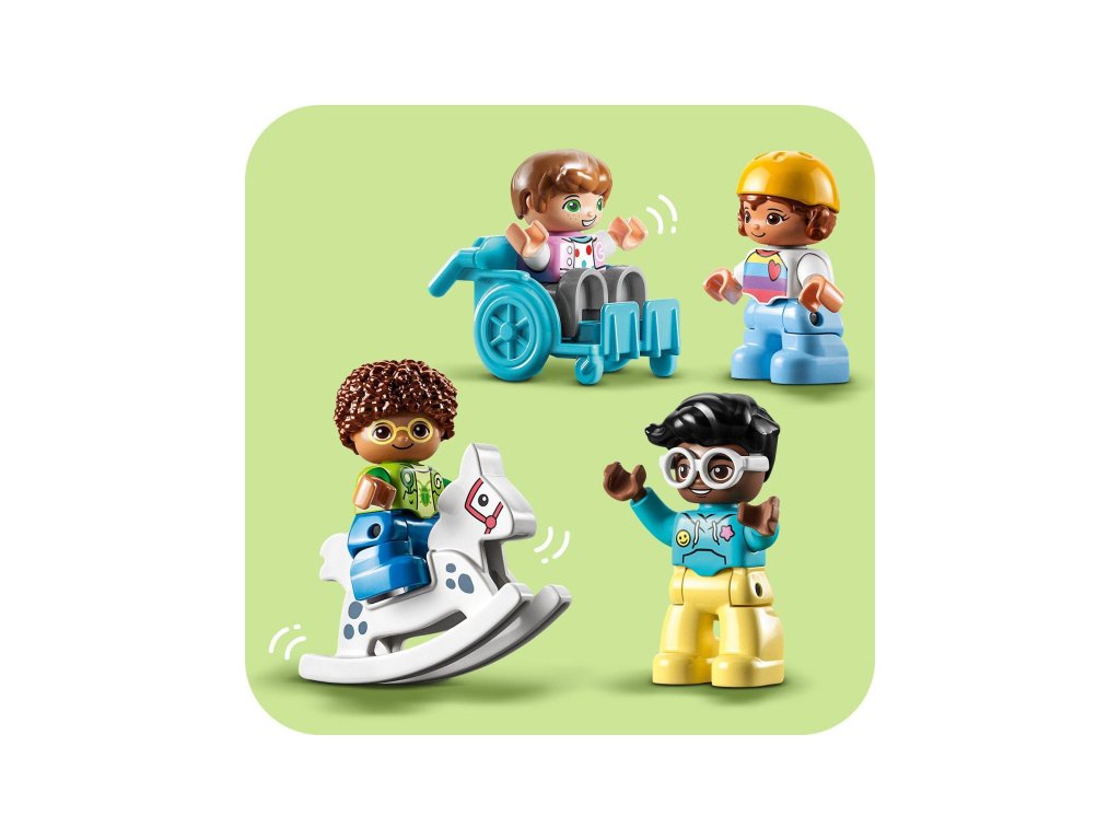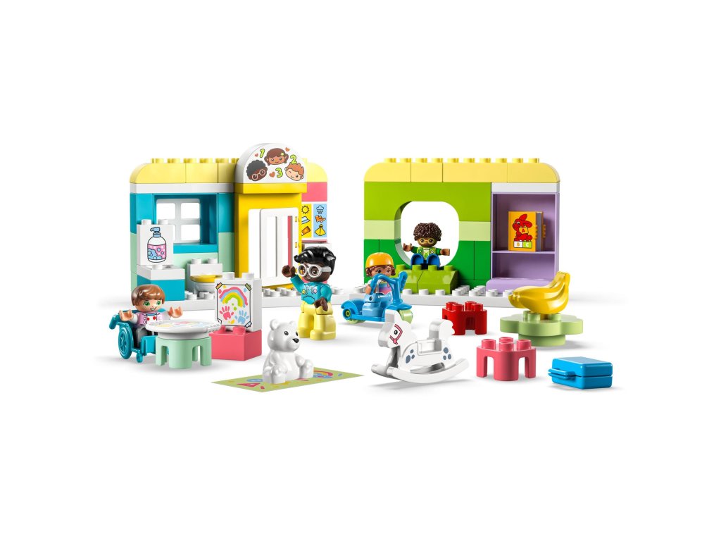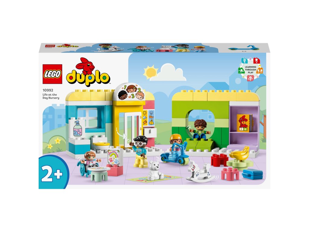 Batoľatá od 2 rokov si užijú zábavu s kamarátmi s touto stavebnicou LEGO® DUPLO® Town Zábava v škôlke (10992). Táto vzdelávacia hračka umožňuje deťom zahrať sa na každodenný svet a zároveň sa učiť o číslach a farbách. Množstvo realistickej hry Stavebnica je plná kreatívnych aktivít a rodičia a deti sa môžu zahrať sa na scénky a postavy ako v skutočnej škôlke. Vo výtvarnom ateliéri si deti môžu vyskúšať maľovanie prstami, alebo si pochutnať na občerstvení. Deti na vozíčku môžu zísť po rampe a pridať sa ku svojim kamarátom, ktorí premávajú po dvore na kolobežke. V kúpeľni so záchodom a umývadlom môžu rodičia naučiť deti o tom, aké dôležité je umývanie rúk. Podnecovanie zmyslov Ako všetky hračky LEGO DUPLO pre batoľatá, aj táto stavebnica má pestrofarebné kocky navrhnuté tak, aby boli pútavé na hranie a stavanie, zatiaľ čo textilná podložka s číslami je príjemná na dotyk. Stavebnice LEGO