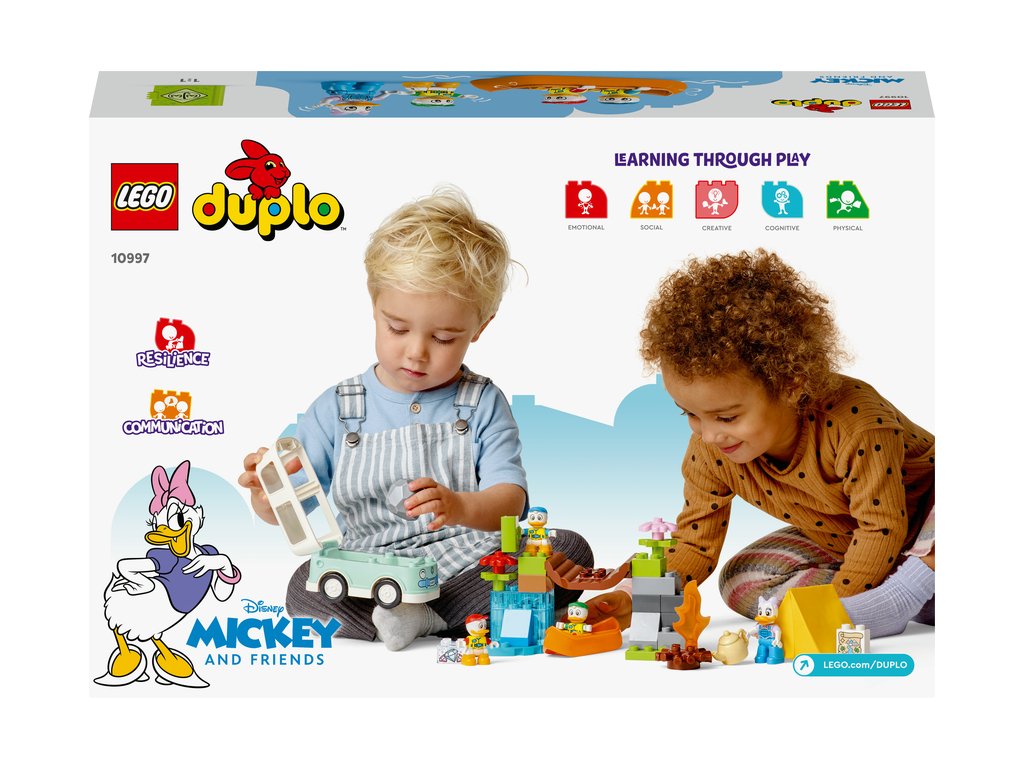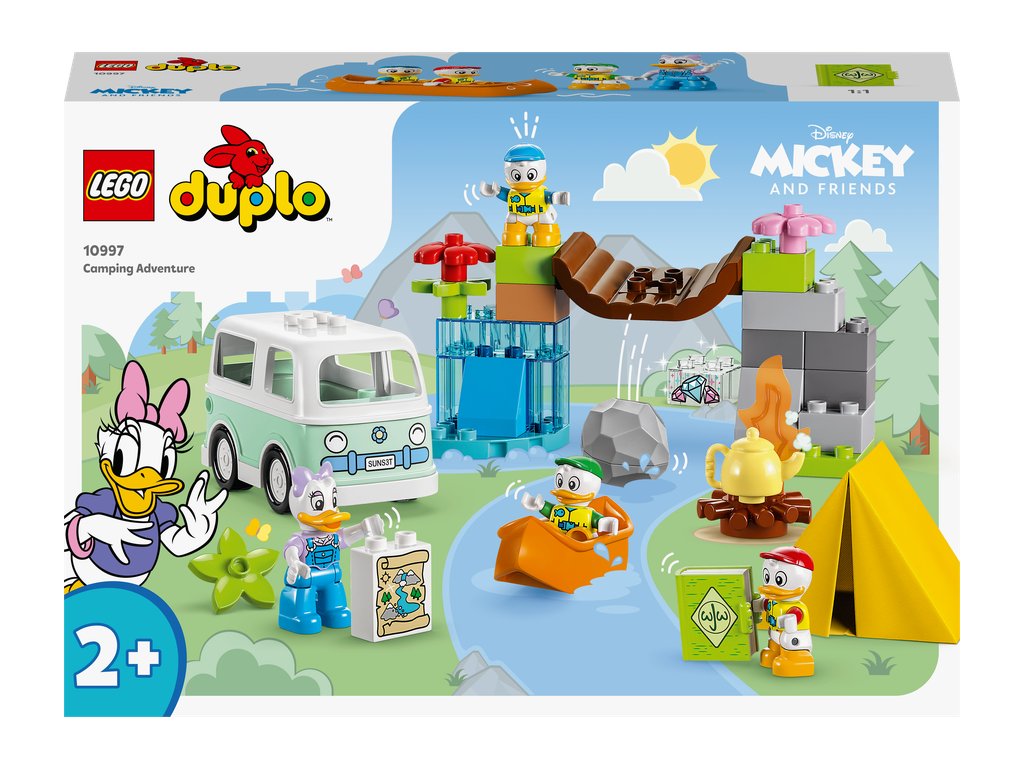 Premeňte hodiny hrania na zábavné učenie hrou so stavebnicou LEGO® DUPLO® ǀ Disney Mickey a priatelia: Dobrodružná kempovačka (10997). Táto zábavná stavebnica plná kreatívnych aktivít pomáha deťom od 2 rokov učiť sa odolnosti a tímovej práci. Drobci sa môžu pridať ku Kačke Daisy a jej synovcom na ich dobrodružnom výlete Zostaviteľná hračka, ktorá rozvíja predstavivosť Deti sa vyberú na dobrodružstvo v prírode spolu s Kačkou Daisy, Hueyom, Deweym a Louiem v obytnej dodávke na kolesách. Nájdu mapu s pokladom a na kanoe sa plavia riekou okolo vratkého mosta, z ktorého takmer spadne balvan. Poklad nájdu za zostaviteľným hračkárskym vodopádom, nachystajú si táborák a zababušia sa v stane. Deti sa učia zručnosti do života Počas stavby tohoto vzdelávacieho modelu si deti rozvíjajú zručnosti jemnej motoriky. Hra na rodinu im pomôže zlepšiť sa v empatii, v sebavyjadrovaní a v spolupráci s ostatnými, čo sú všetko výv