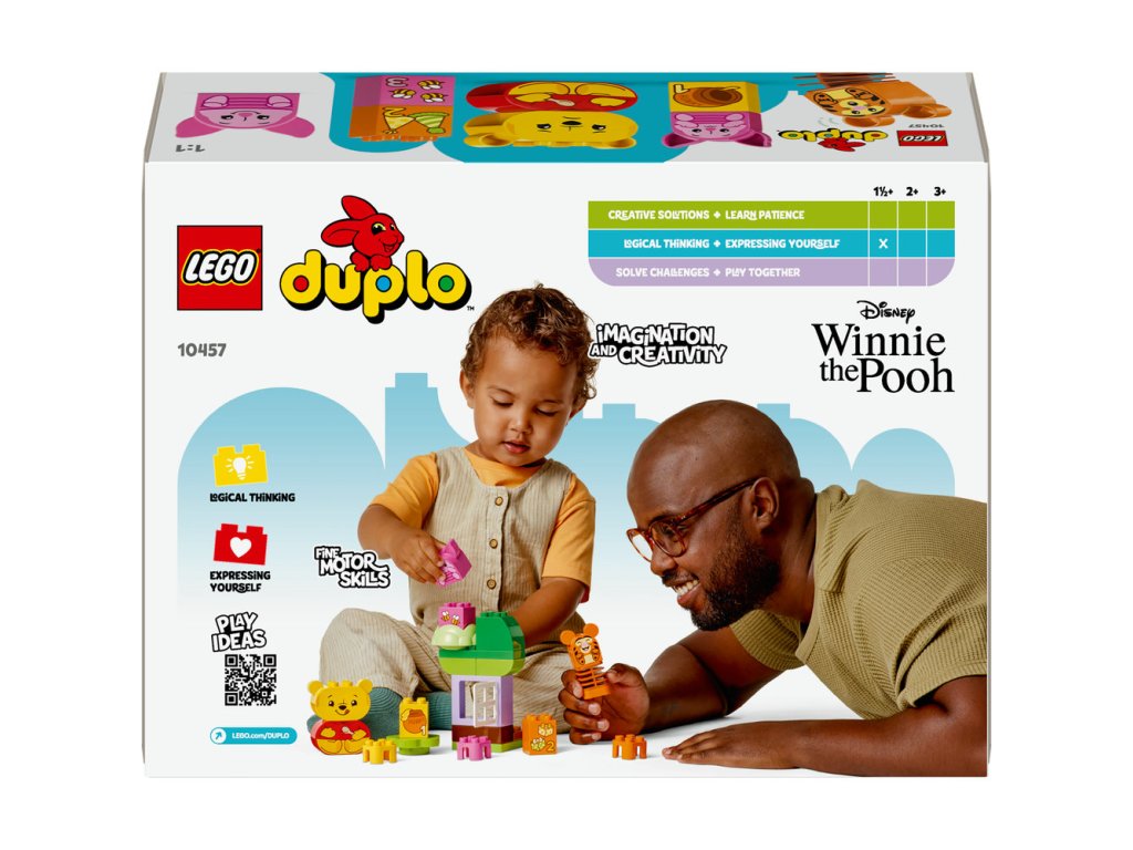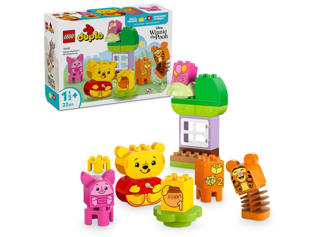Táto farebná vzdelávacia stavebnica pomáha batoľatám od 18 mesiacov v precvičovaní ich raných zručností a zároveň si užijú nápadité hry. Malé deti sa hrajú, že sa chystajú na oslavu s 3 figúrkami LEGO DUPLO: Mackom Pú, Tigrom a Prasiatkom. Každá postava má obojstrannú tvár s dvomi rôznymi výrazmi, takže deti si môžu vymýšľať nekonečne tvorivé hry a nové príbehy. Tátozábavná funkcia podporí aj sociálno-emocionálne vzdelávanie pre batoľatá, ktoré skúmajú rôzne emócie, ktoré môžu cítiť počas osláv, od radosti z otvárania darčekov až po nepríjemný pocit po zjedení mnohých sladkostí! Táto hračkárska stavebnica pomáha malým deťom precvičovať si triedenie farieb popri spájaní narodeninových darčekov so zvieracími postavičkami. Každý darček je navyše očíslovaný, takže deti si môžu dokonca prvýkrát vyskúšať počítanie.