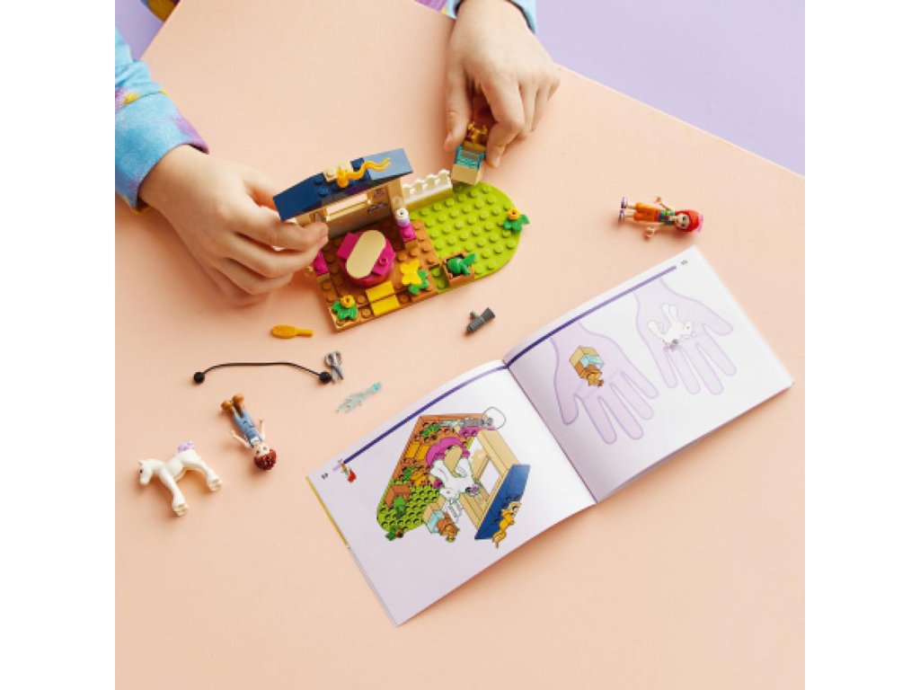 - Hra na postavy v obklopení zvierat – Tento kreatívny darček pre deti malému staviteľovi v hrách osprchovať poníka zo série LEGO® Friends, strihať mu hrivu a srsť a potom ho odmeniť jablkom