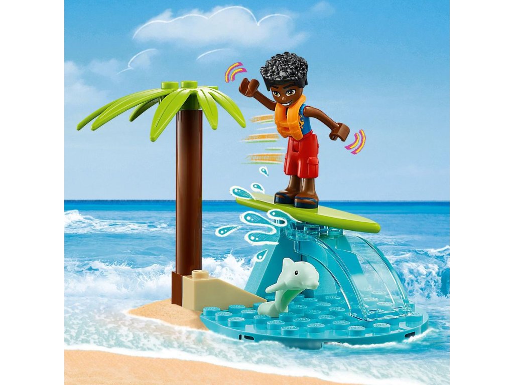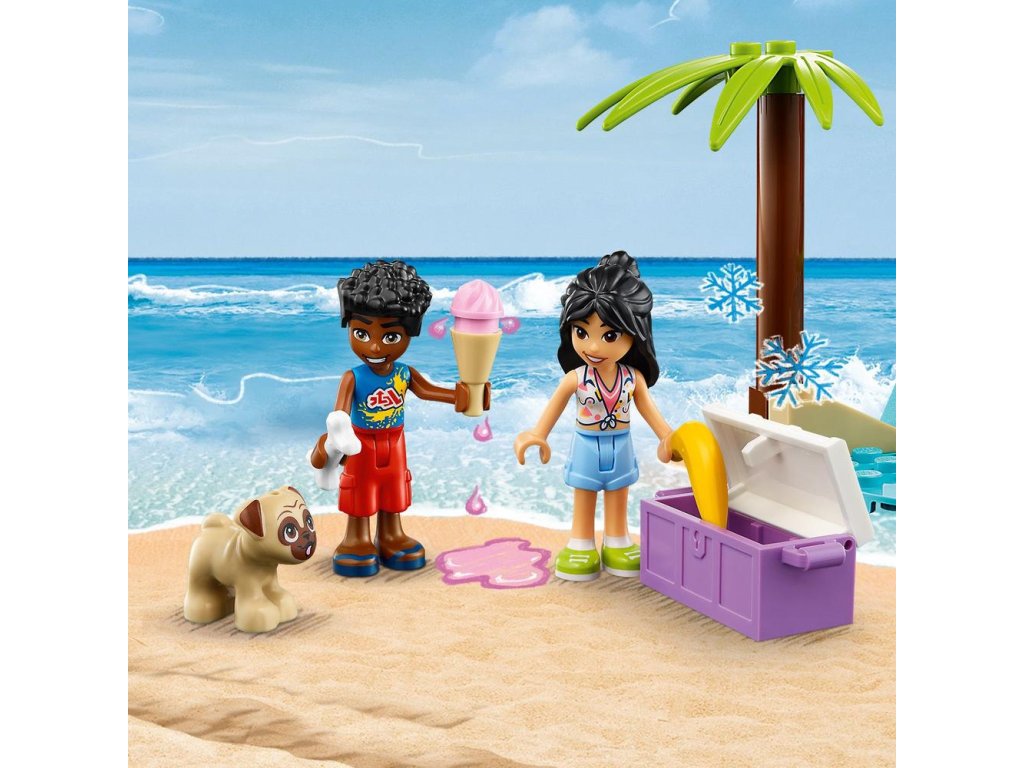 - 2 minibábiky a doplnky – Stavebnica obsahuje LEGO® Friends postavičky Liann a Zaca, mopslíka, delfína, plážovú buginu, chladiaci box a vlnu