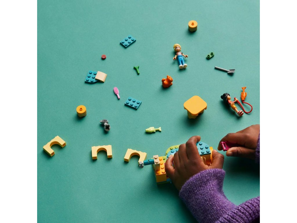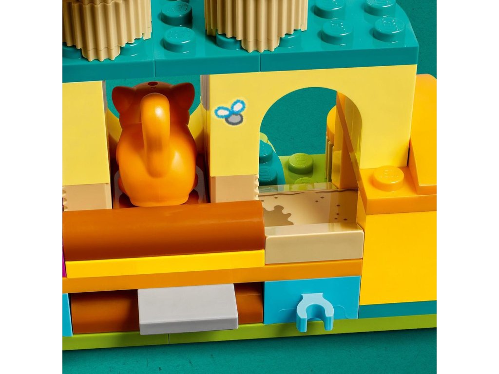 Stavebnica obsahuje zostaviteľné ihrisko, 2 minifigúrky, 2 postavičky zvieratiek a doplnky na starostlivosť o zvieratá vrátane hračkárskej rybičky, kocúrnika obyčajného, krmiva a odpadkového koša.