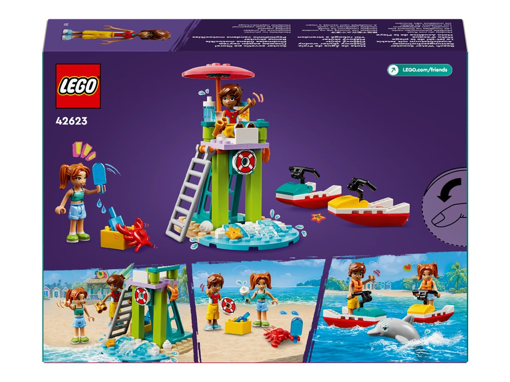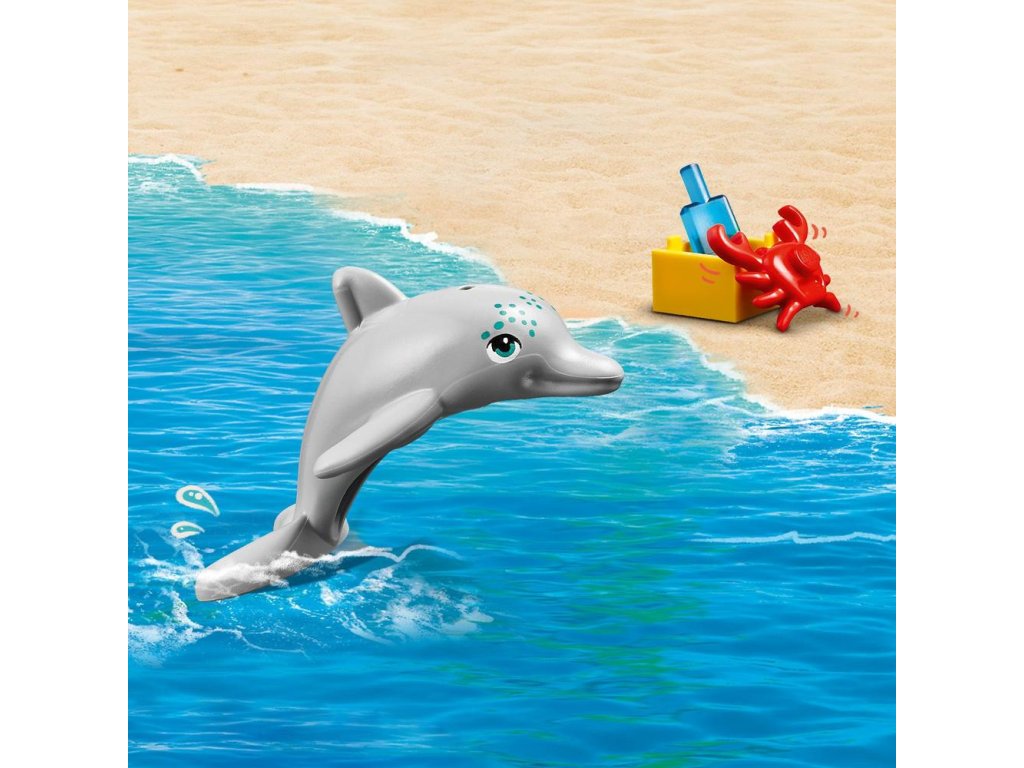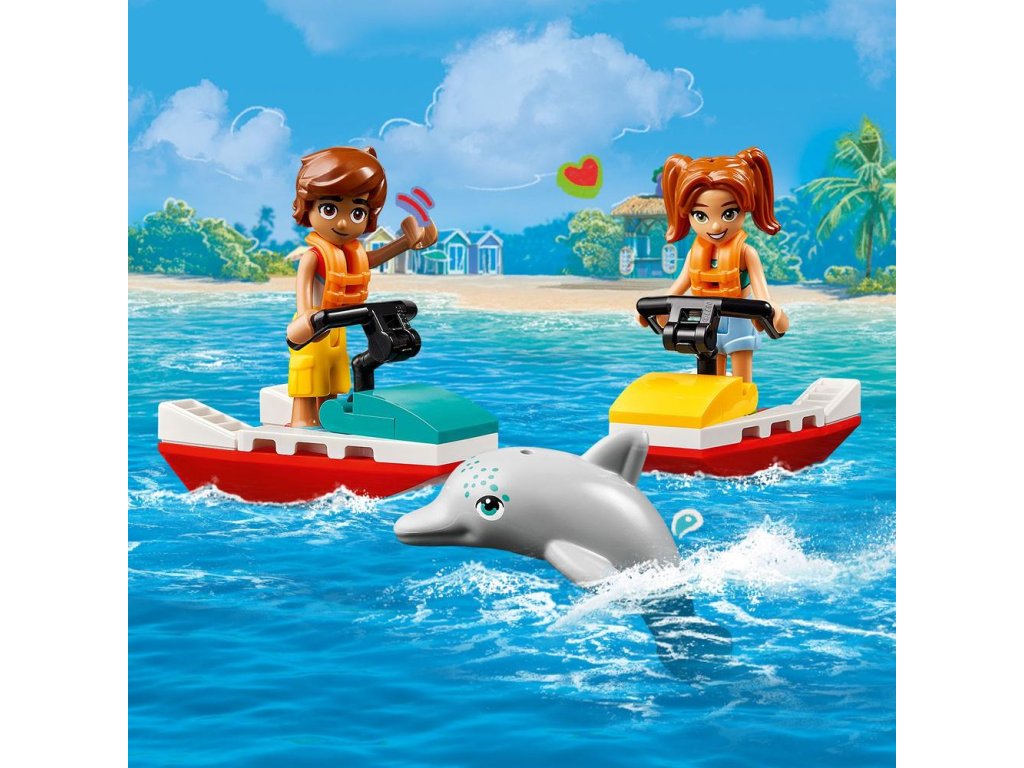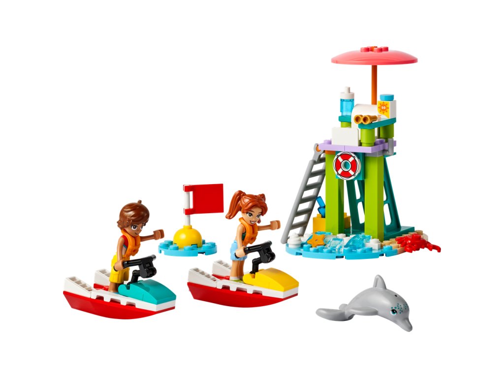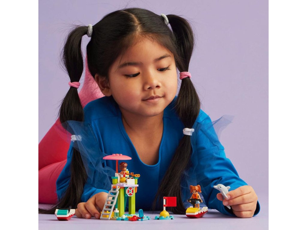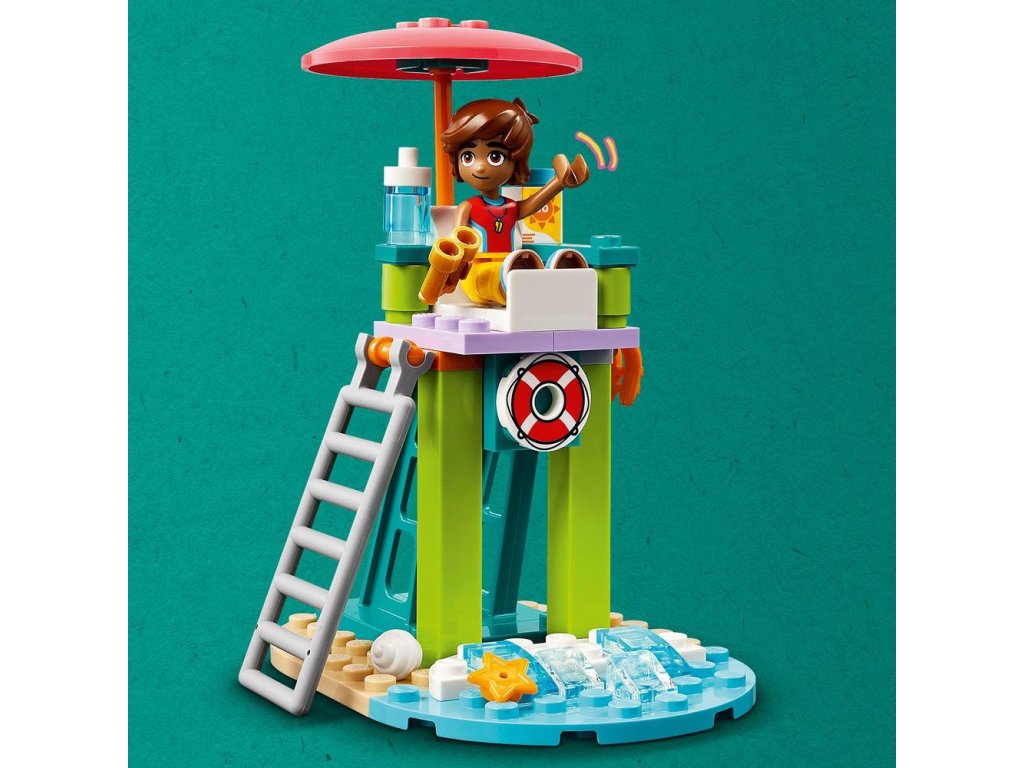 Táto stavebnica LEGO s plavčíkom obsahuje 2 hračkárske plážové skútre, takže deti si môžu zinscenovať množstvo príbehov. Leo má dnes službu plavčíka a prostredníctvom ďalekohľadu pozoruje oceán. Má perfektný výhľad aj na sledovanie delfínov! Neskôr sa pridá k svojej kamarátke Candi a kamaráti sa pretekajú na vodných skútroch. Deti si zamilujú drobné detaily, vrátane drzého kraba, ktorý sa rád približuje ku chladničke s nanukmi!
