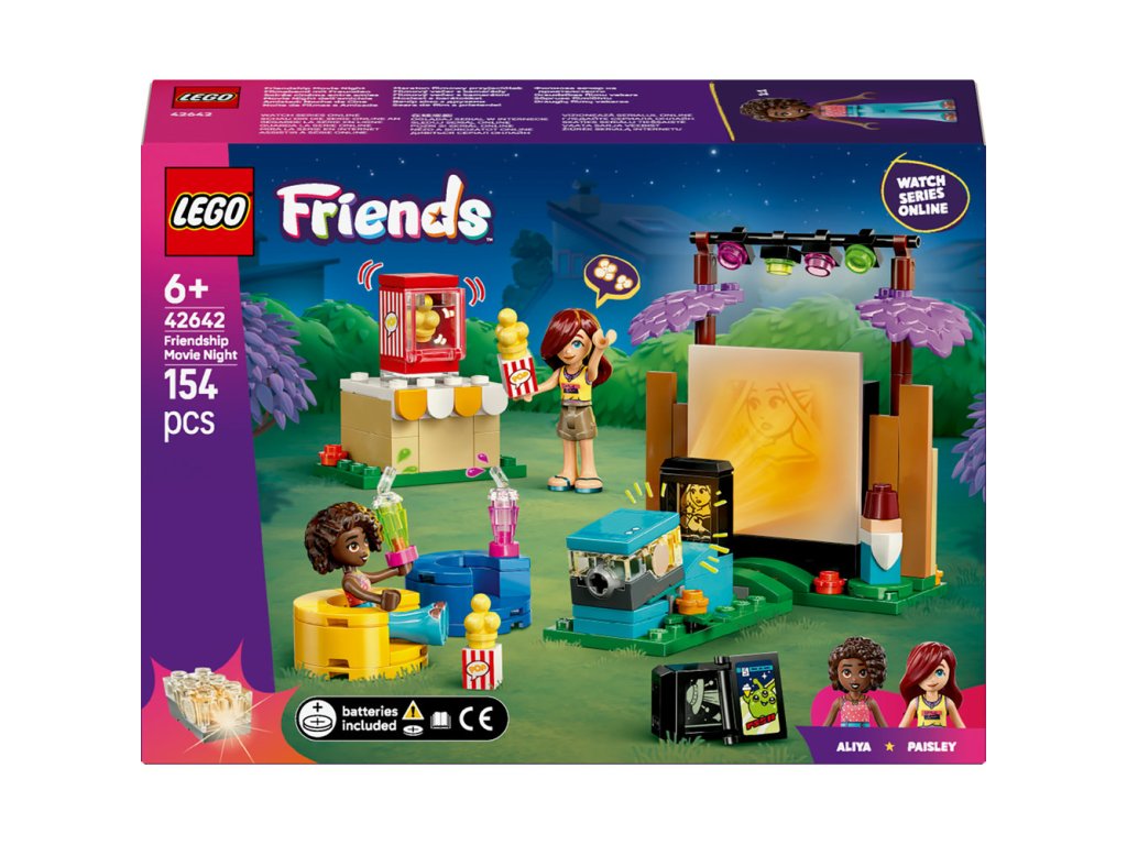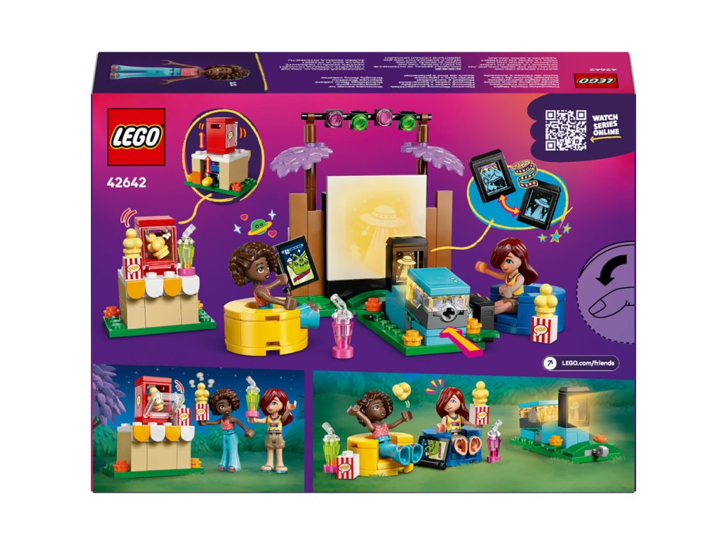 Táto napínavá stavebnica pre deti je plná kúzla filmovej noci! Dievčatá, chlapci a všetci filmoví fanúšikovia od 6 rokov si môžu postaviť svoje obľúbené trháky s hračkou LEGO® Friends Filmový večer s kamarátmi (42642). Súčasťou zábavnej stavebnicesú 2 minibábiky LEGO Friends a množstvo doplnkov na tvorivé hry. Svetlá, kamera, kamarátky! Deti si vymyslia príbehy o kamarátkach Paisley a Aliyi, ktoré si užívajú filmový večer v Paisleyinej záhrade. Vložte film do projektora a stlačte svetelnú kocku , čím sa rozsvieti obraz na veľkej obrazovke. Objavte množstvo doplnkov vrátane automatu na popcorn s páčkou, vďaka ktorému bude popcorn „pukať“! Medzi ďalšie doplnky patrí krabička na popcorn, nápoje, komiks a 2 pohodlné kreslá.