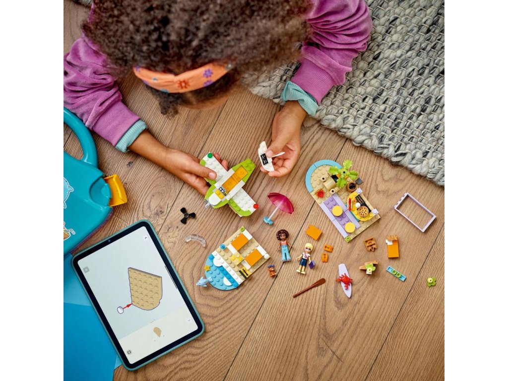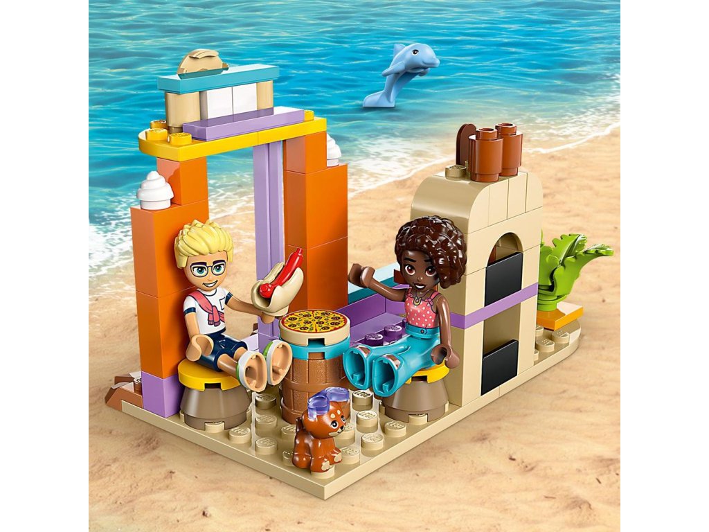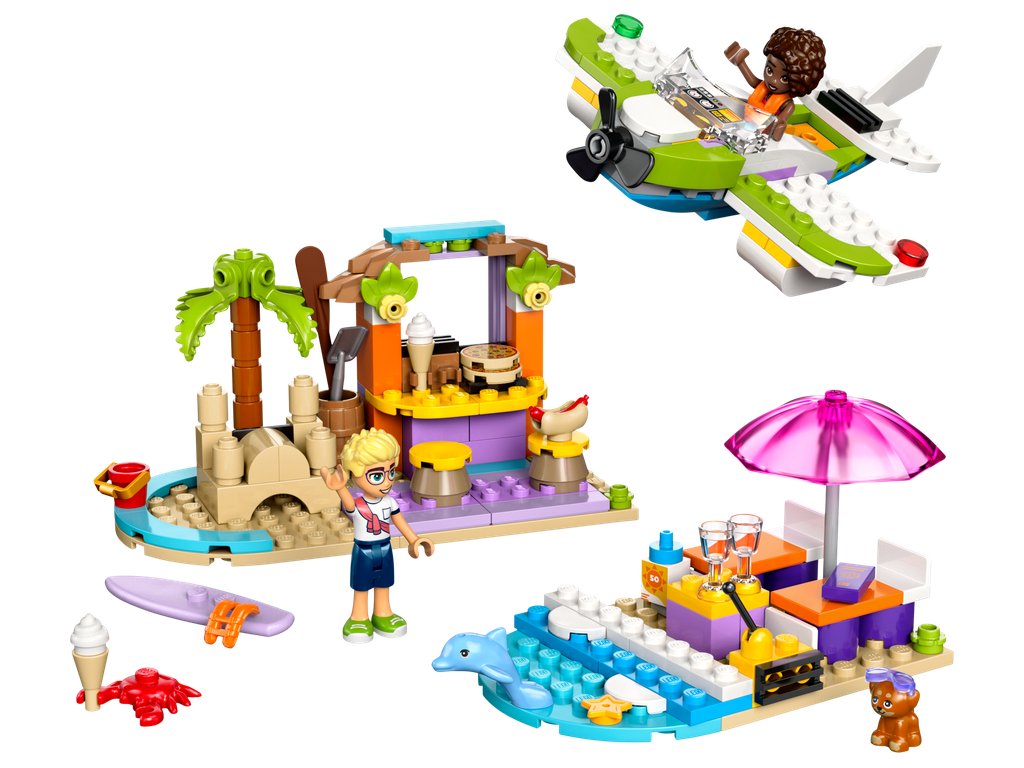 Táto stavebnica s postavičkami obsahuje všetko, čo budú deti potrebovať na zostavenie hračkárskeho vodného lietadla s rotujúcou vrtuľou, relaxačnú zónu so surfom a kaviareň na pláži s hradmi z piesku, posedením a zmrzlinami. Modely potom môžete prestavať na hračkársky motorový čln, vonkajšie posedenie a pizzeriu s pecou. Stavebnica obsahuje 2 minibábiky a figúrky psa a delfína na hry na postavy.
