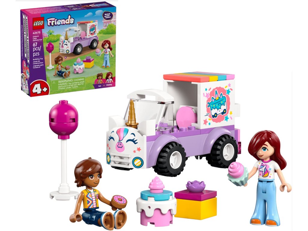- NARODENINOVÉ HRAČKY – S modelom LEGO® Friends Jednorožie donáškové auto s tortou (42675) môžete vstúpiť do sveta škôlkárskych vzdelávacích aktivít, napríklad rozpovedať príbehy s narodeninovým darčekom, hračkárskou tortou, balónom a donutom