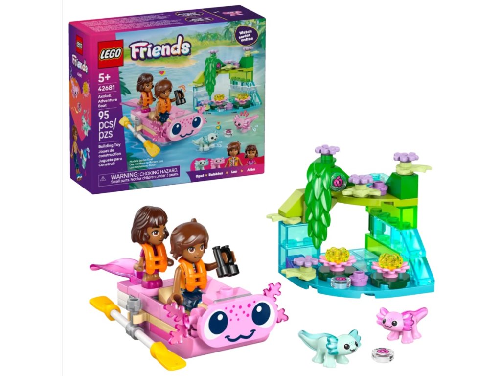 - STAVEBNICA S AXOLOTLAMI – Detská stavebnica LEGO® Friends Dobrodružný čln s axolotlami (42681) obsahuje drobný čln, 2 postavičky a 2 mini hračkárskych axolotlov, aby sa dievčatá a chlapci od 5 rokov mohli ponoriť do zábavných hier