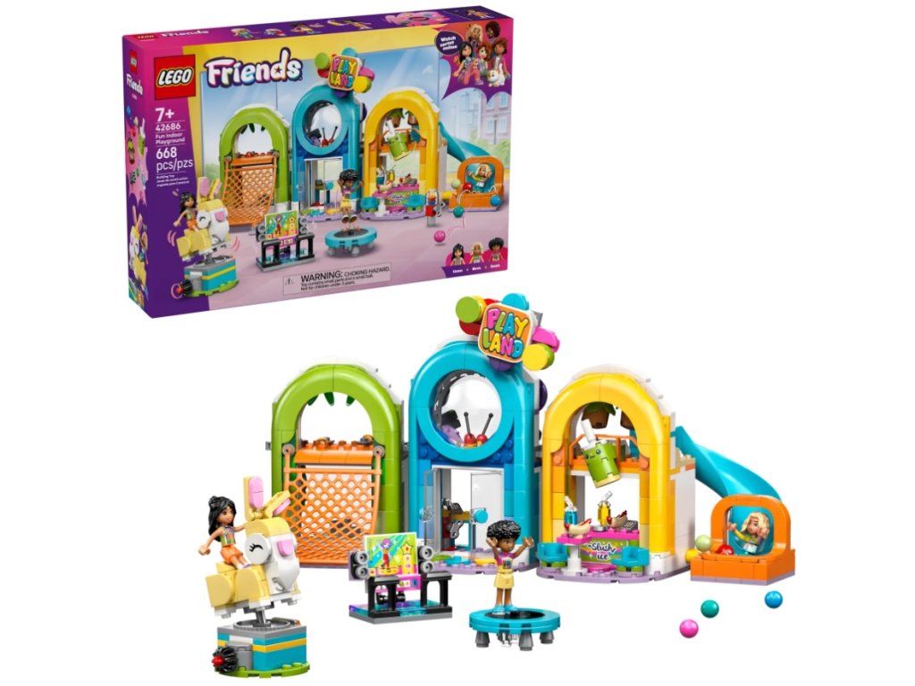 Nechajte fantáziu naplno pracovať, keď dievčatá aj chlapci objavujú stavebnicu LEGO® Friends Zábavné interiérové ihrisko (42686) pre deti od 7 rokov. V tejto akčnej stavebnici nájdete 3 minibábiky a množstvo doplnkov spolu s prekážkami, výzvami a jazdami, ktoré si môžu užiť.Deti sa z tohto ihriska nebudú chcieť ani pohnúť. Ponoria sa totiž do hodín nekonečných hier na postavy a vymyslia postavičkám rozmanité dobrodružstvá. Zábava čaká na každom rohu, keďže sa tu nachádza lezecká sieť, prekážky,kolotoč, bazén s loptičkami, šmykľavka, jazda na zajačikovi a bufet. To však zďaleka nie je všetko! Medzi ďalšie detaily, ktoré podnecujú kreativitu, patrí tanečný stroj, trampolína, hotdogy, limonády, automat na žuvačky a pokladne. Stavebnica nadchne ako zábavný darček pre dievčatá a chlapcov, ktorí sa radi hrajú na postavy a využívajú svoju tvorivosť na vymýšľanie rôznych príbehov. Deti si vychutnajú jednoduché a intuitívne staviteľské dobrodružstvo s aplikáciou LEGO® Builder, v ktorej si môžu modely približovať a otáčať pomocou 3D návodu, ukladať si stavebnice a sledovať postup. Stavebnica obsahuje 668 dielikov.
