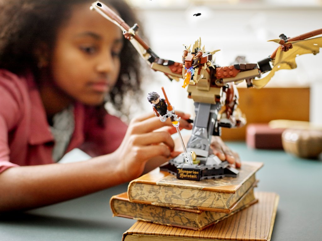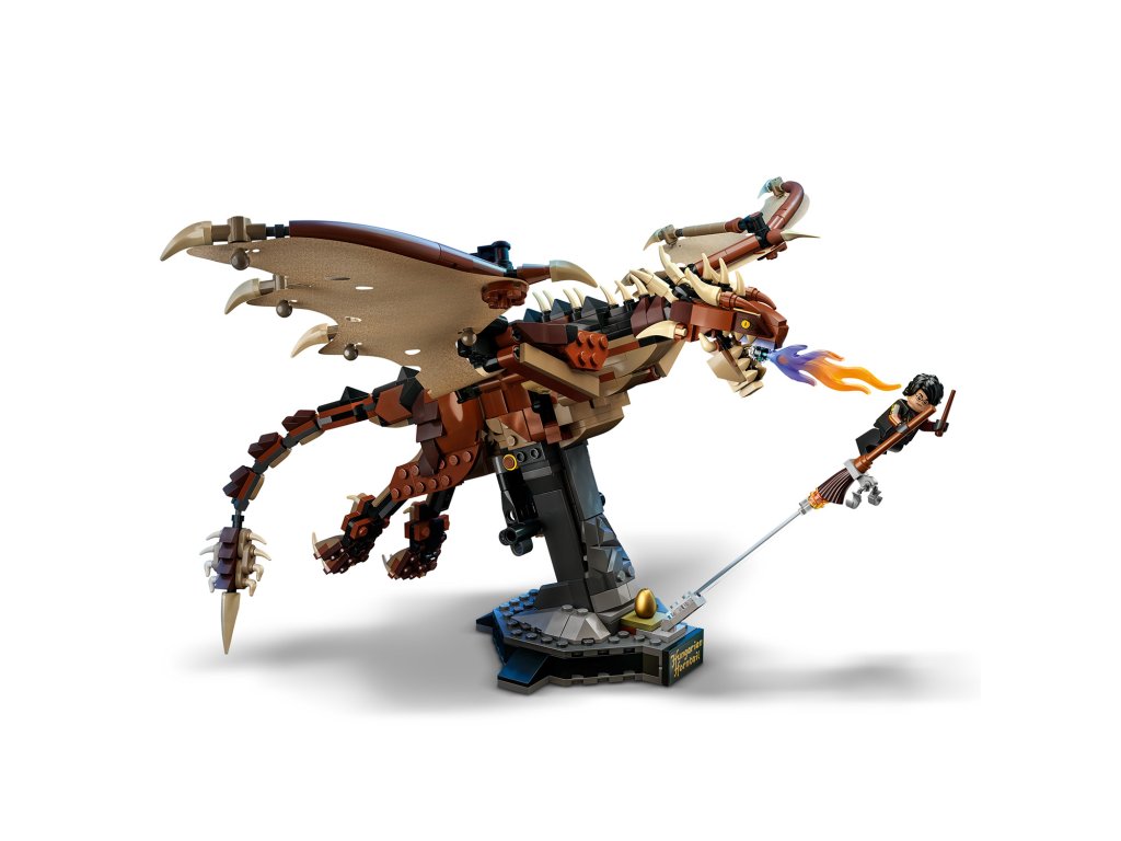 - Očarujúce detaily – realistického modelu je minifigúrka Harryho Pottera letiaceho na Blesku, zlatá vajce z Trojčarodníckeho turnaja a látka na znázornenie draka membránových krídel