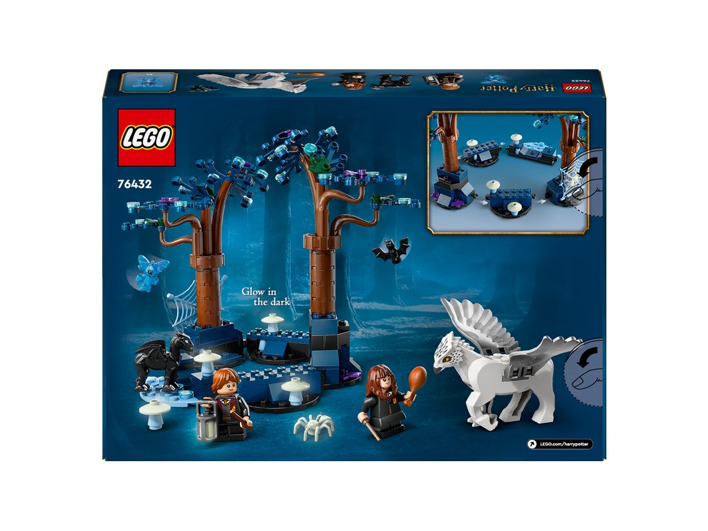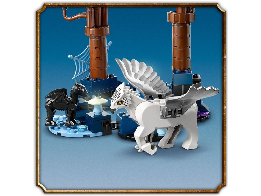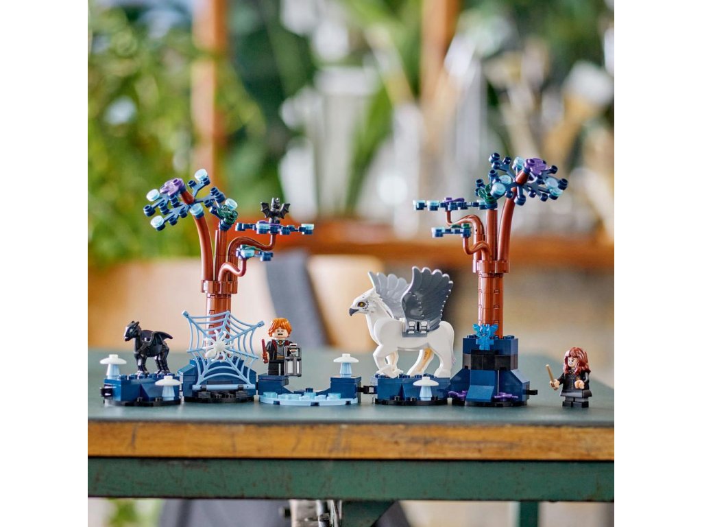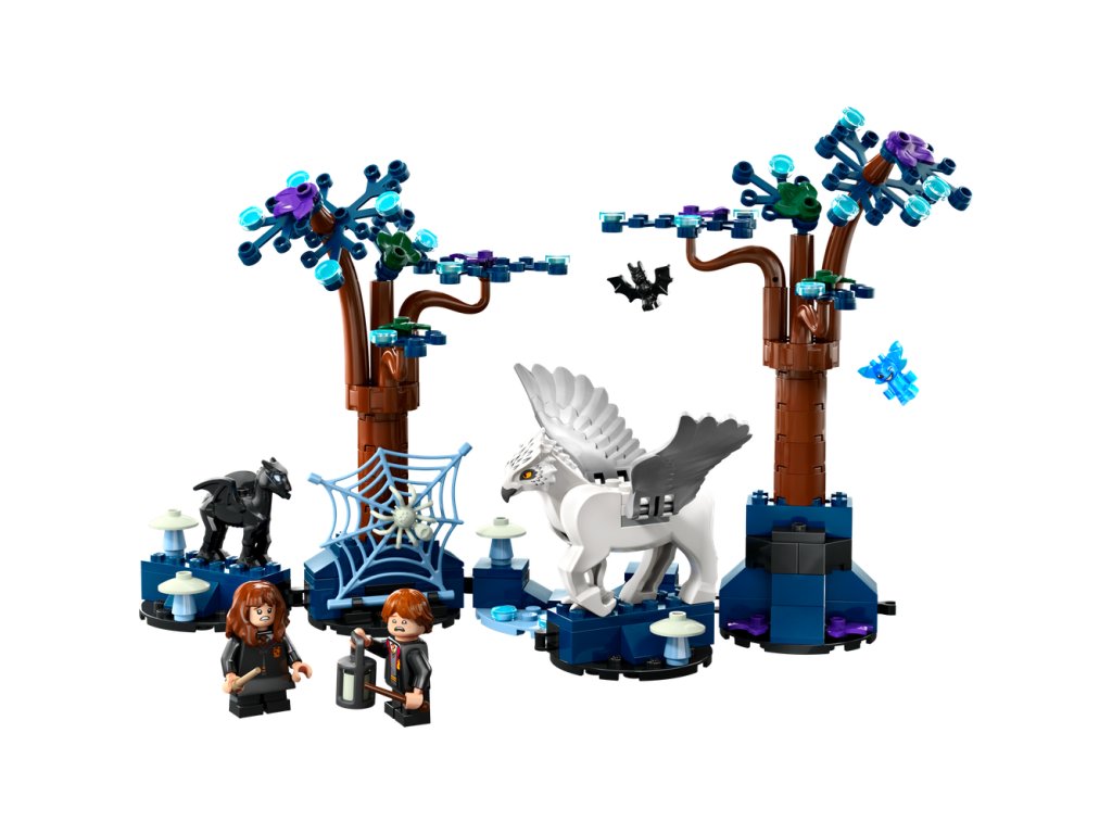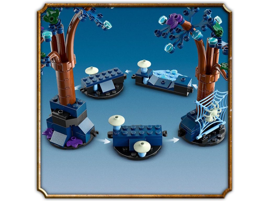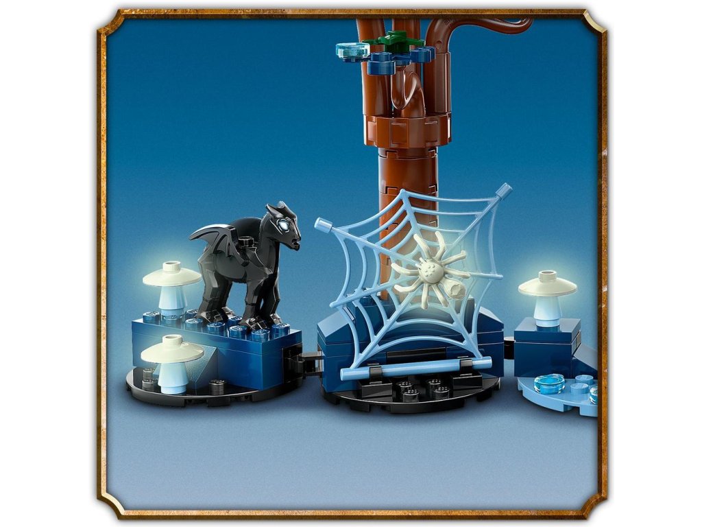Model obsahuje stromy s prvkami listov v nočných farbách, svietiaceho hračkárskeho pavúka a 4 svietiace huby, ktoré dotvárajú čarovnú atmosféru. Stavebnica obsahuje aj 2 minifigúrky LEGO – Rona Weasleyho a Hermionu Grangerovú – plus figúrku hračkárskeho Hrdozobca, figúrku malého testrala a figúrku Cornwallského piadimužíka na hru na postavy. Deti si môžu tiež prestavovať moduly v tejto prispôsobiteľnej stavebnici a vytvárať tak rôzne scény.