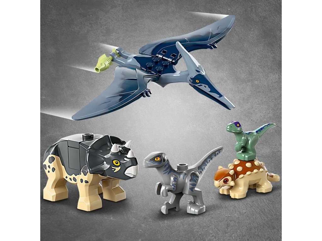 Model obsahuje terénne vozidlo a výskumné laboratórium s jaskynnou stenou, obe s prvkami štartovacích kociek, a navyše stanicu, kde sa kŕmia dinosaury. 2 minifigúrky, figúrka mláďaťa ankylosaura, triceratopsa a velociraptora a malé figúrky mláďatka dinosaura velociraptora a dospelého pteranodona umožňujú deťom pustiť sa rovno do hry.