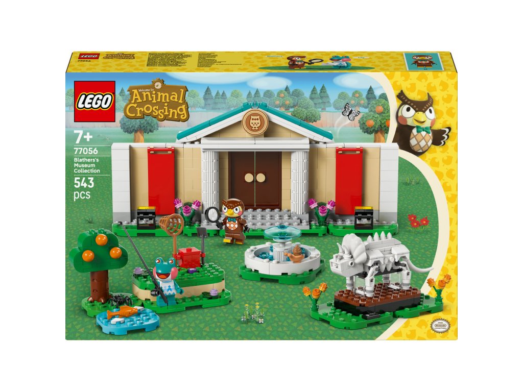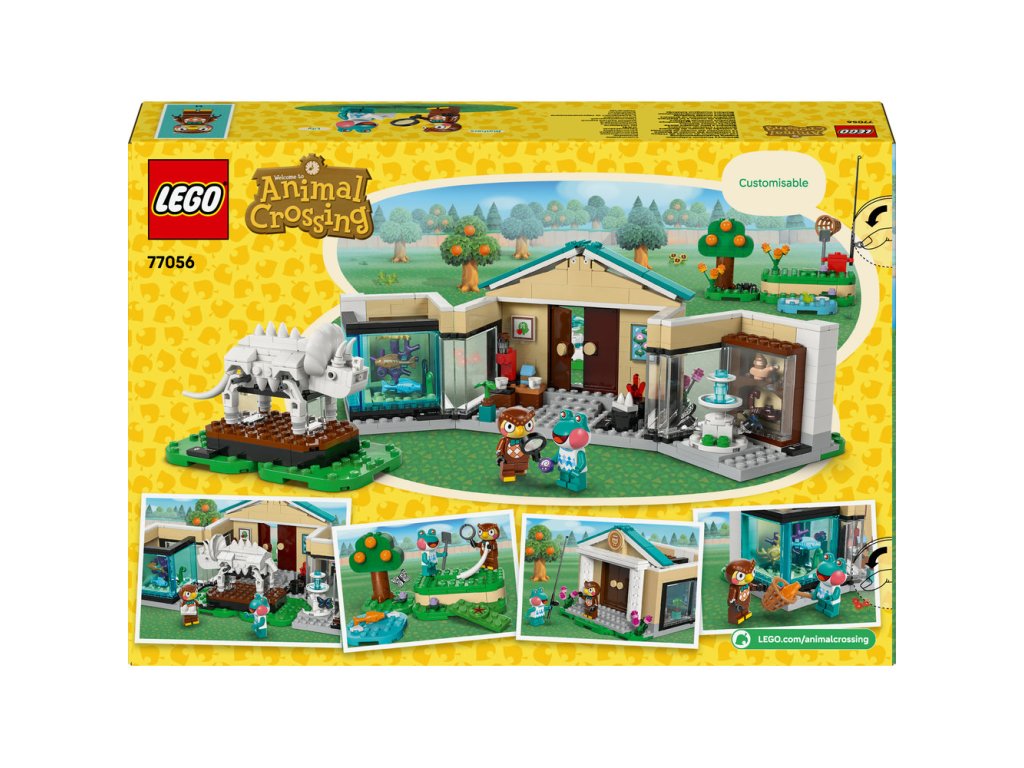 Táto stavebnica LEGO® pripomína múzeum z videohry Animal Crossing. Deti môžu umiestniť svoje nálezy do rôznych miest v múzeu a prispôsobiť si ho podľa seba. Rýľom môžu vykopať chýbajúcu kostrč triceratopsa, potom môžu navnadiť ryby do akvária a chytať motýle a strašidelné chrobáky do sieťky. Vďaka sklopným stenám a prestaviteľným prvkom si stavebnicu môžete upraviť a užiť ešte viac herných možností. Súčasťou modelu je aj fontána a kaviareň Roost, kde si deti oddýchnu s minifigúrkami Blathers a Lily a potom sa vydajú na ďalšie dobrodružné objavovanie prírody. Malých staviteľov čaká aj digitálna zábava počas stavania s aplikáciou LEGO Builder, kde si môžu približovať a otáčať svoje modely v 3D. Stavebnica obsahuje 543 dielikov.