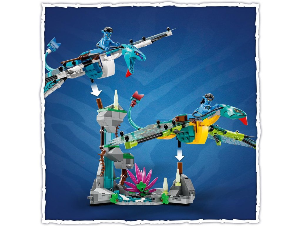 - Čo nájdete v balení – Tento pohlcujúci set LEGO® set obsahuje minifigúrky Jakea Sullyho a Neytiri, 2 zostaviteľné figúrky banshee s pohyblivými priesvitnými krídlami a horský model s dielikmi svietiacimi v tme