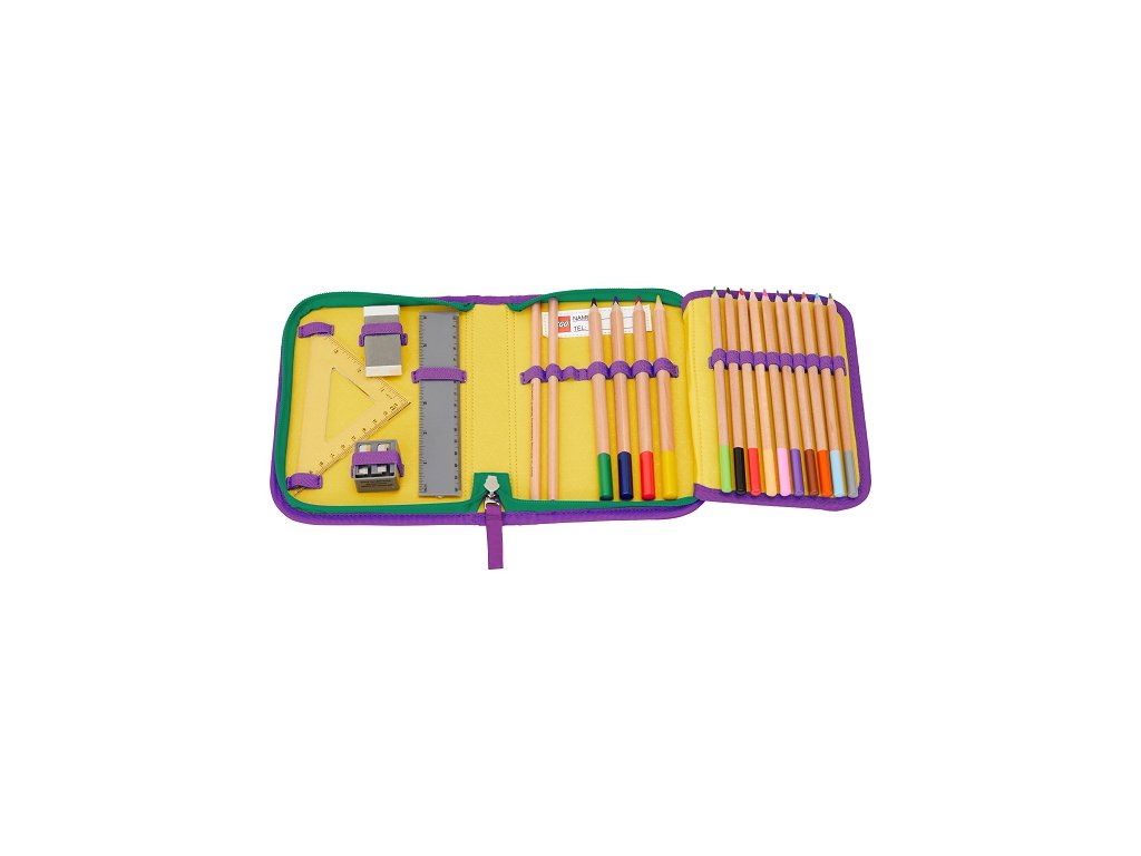 Puzdro je dodávané s náplňou: 2 grafitové ceruzky, 10 farebných pasteliek, 4 široké farebné pastelky, guma na gumovanie, strúhadlo, rovné a trojuholníkové pravítko. Puzdro obsahuje rozvrh hodín v priehľadnom vrecku a všitú vnútornú menovku. Je vyrobené z odolného materiálu bez použitia PVC. K dostaniu v mnohých obľúbených LEGO motívoch. Ideálny pre prvý ročník základnej školy.