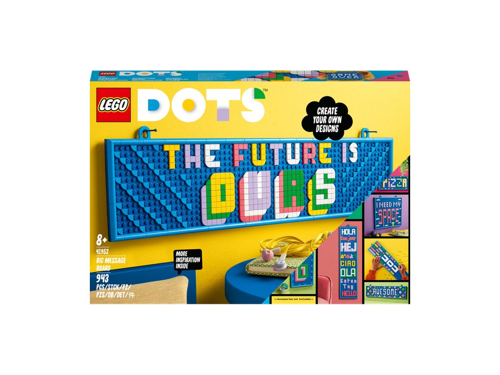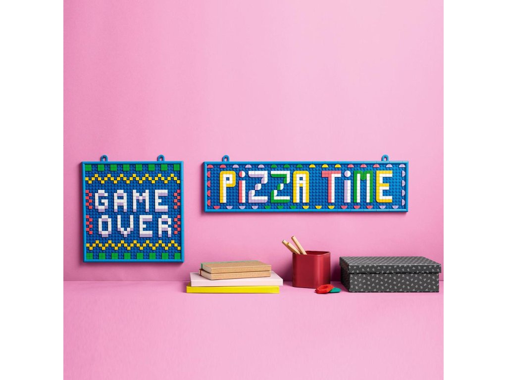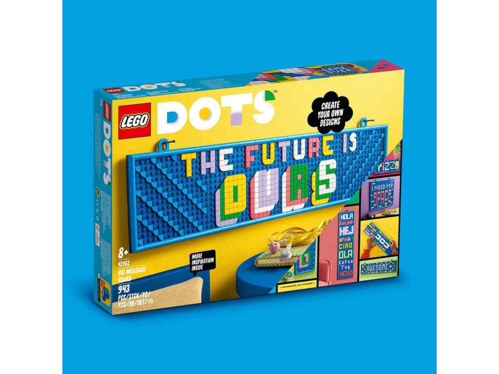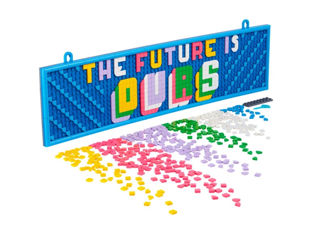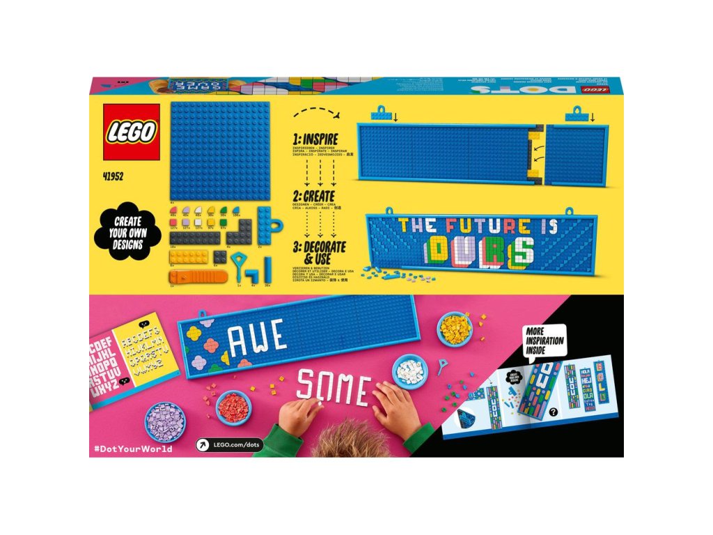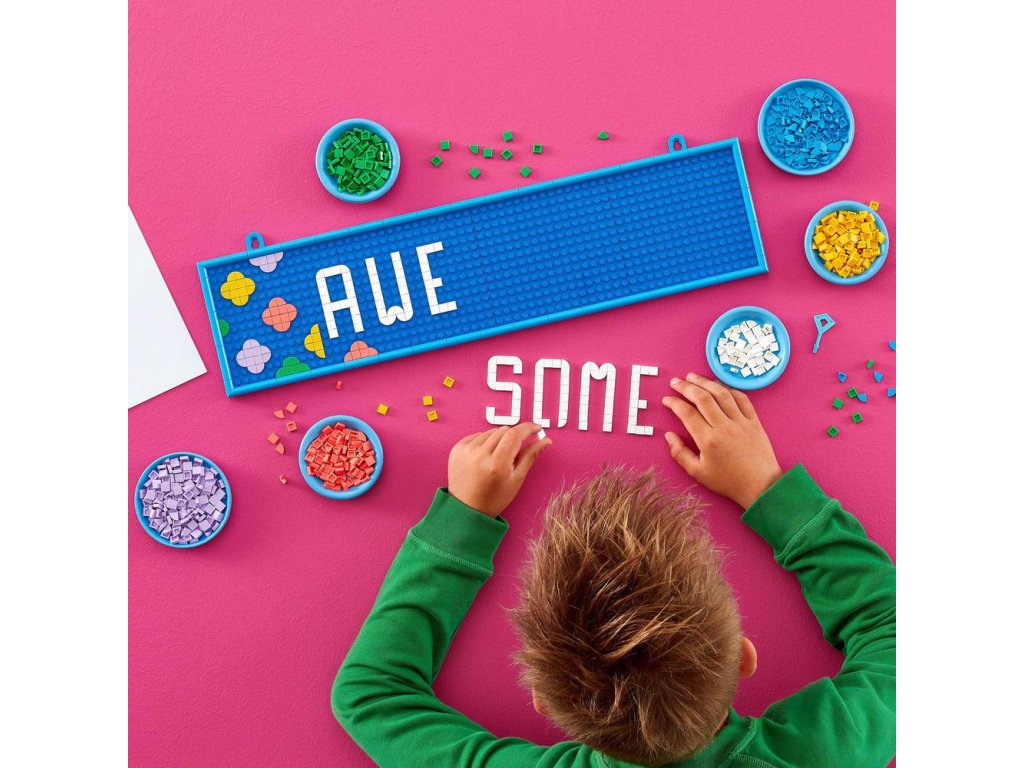 - Vyskladajte si odkaz alebo dizajn – Pomocou dielikov zo sady Záplava DOTS dielikov – písmenká (41950, predáva sa samostatne) alebo iných stavebníc LEGO® si môžu deti svoju nástenku prispôsobiť a zapracovať na svojich dizajnérskych zručnostiach