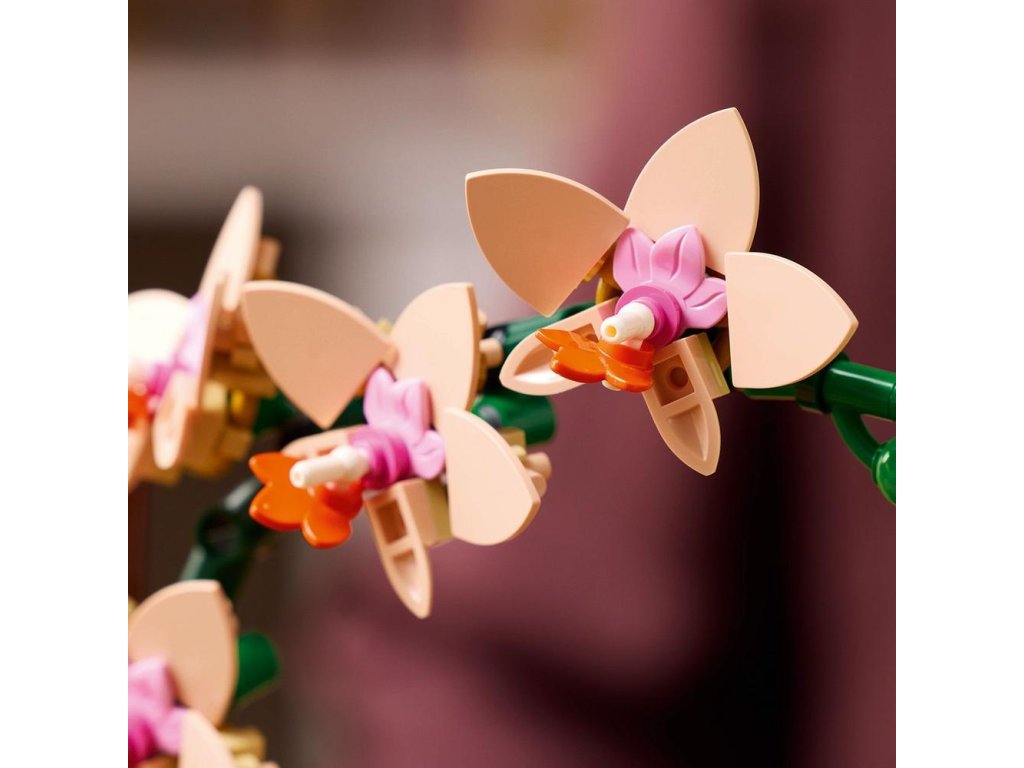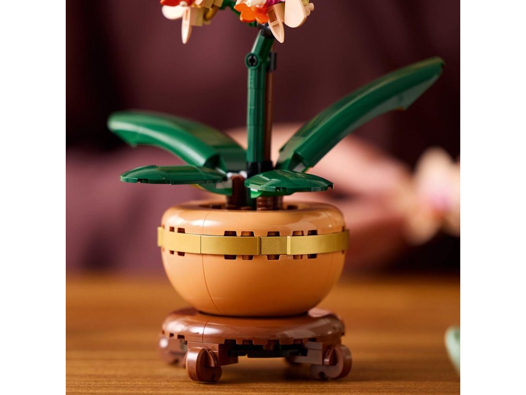 Realistická replika orchidey obsahuje 5 rozkvitnutých kvetov, niekoľko ďalších kvetov v púčikoch a listy. Súčasťou modelu je aj svetlý terakotový kvetináč na krásnom podstavci s dreveným efektom, vďaka čomu môžu začínajúci kvetinári vystaviť svoju kvetinu LEGO vo svojom byte či kancelárii, kam vnesie kúsok pokojnej prírody.