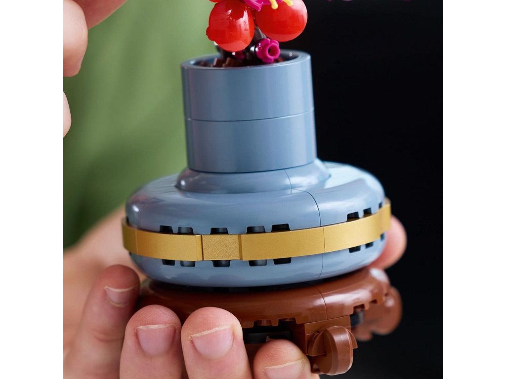 Táto prepracovaná replika marhule japonskej zachytáva eleganciu ikonickej zimnej kvetiny s drevitou stonkou a pestročervenými a purpurovými kvetmi. Kvet je zasadený v pastelovomodrom kvetináči so zlatým pásikom a podstavcom s efektom dreva a hravo ho postavíte. Kvetinová stavebnica vám poskytne obohacujúci staviteľský zážitok a bude krásnym výstavným kúskom v každej domácnosti či kancelárii.