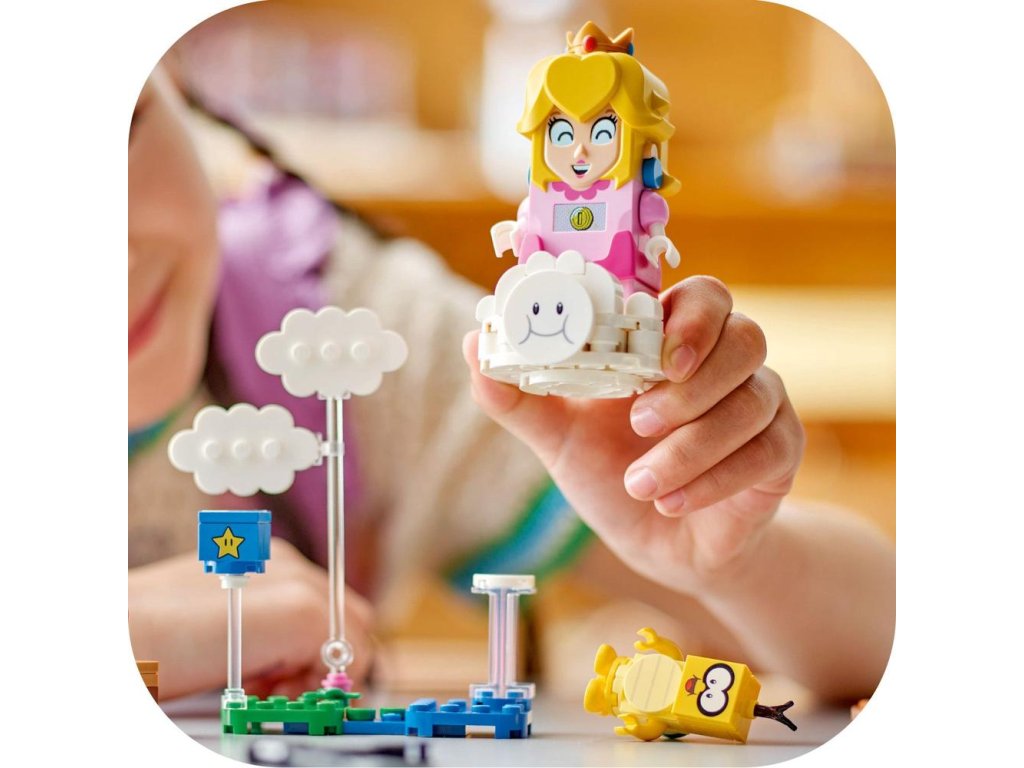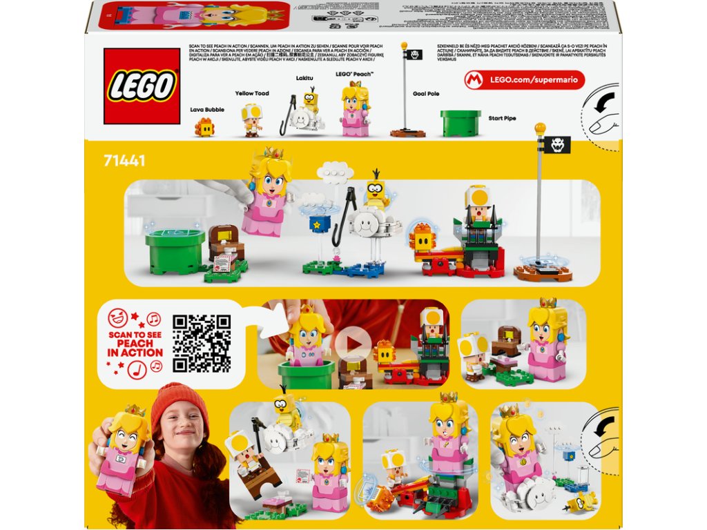 Pridajte sa ku kultovej postavičke zo sveta Super Mario™ na pikniku, lietajte na obláčiku a zachráňte Yellow Toada so stavebnicou Dobrodružstvá s interaktívnou LEGO® Peach™ pre deti (71441). Stavebnica bude fantastickým darčekom Nintendo® pre dievčatá, chlapcov a hráčov od 6 rokov a obsahuje interaktívnu figúrku LEGO Peach, Lakitu, Yellow Toada a Lava Bubble. Cestujte od štartovacieho potrubia ku cieľovej vlajke, aktivujte digitálne reakcie z LEGO Peach a zbierajte mince. Pripravte si piknik, prečítajte si list, v ktorom sa píše, že Yellow Toad bol zajatý, zvrhnite Lakitu z oblaku a lietajte, prevracajte a slučkujte na obláčiku na ceste zachrániť Yellow Toada. Zostaviteľný hračkársky obláčik obsahuje aj rybársky prút, ktorým môže Lakitu dvihnúť piknikovú stoličku Yellow Toada.