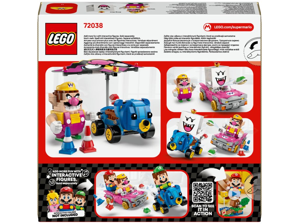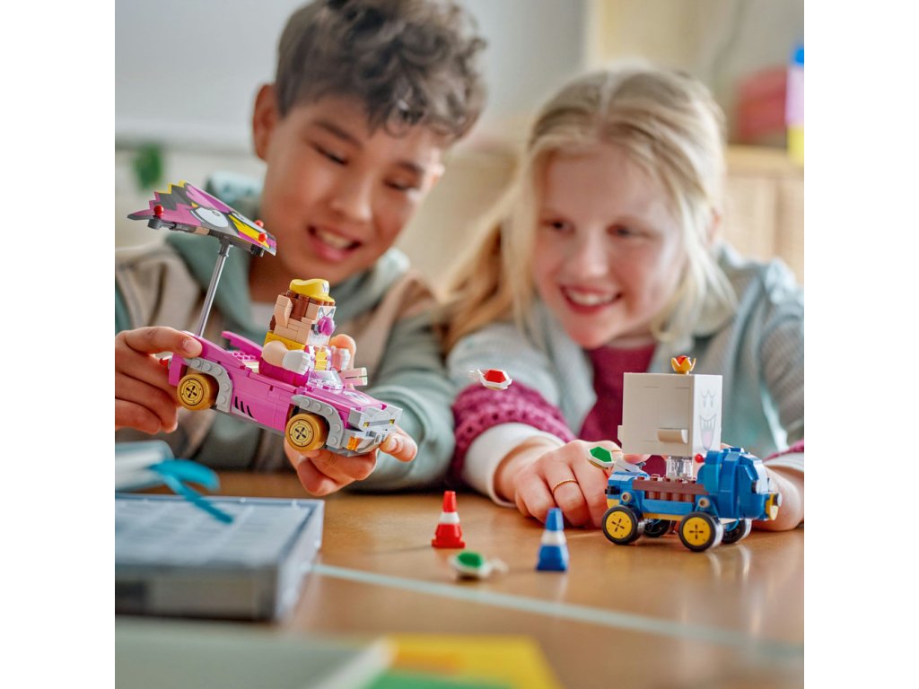 - Interaktívna hra – Jazdite na Badwagon alebo Teddy Buggy s figúrkami LEGO® Mariom, LEGO® Luigim alebo LEGO® Peach™ (nie sú súčasťou balenia), čím aktivujete zvukové/vizuálne efekty Mario Kart™ počas trúbenia, driftovania a ešte viac