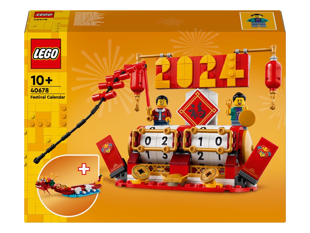 Kalendáre sú skvelým spôsobom, ako osláviť Vianoce. Tento Kalendár sviatkov (40678) pre deti od 10 rokov podnieti ich kreativitu a ponúka im dve zábavné možnosti stavania. Okrem toho sa otáča, takže si deti môžu vybrať, aký dátum sa na ňom zobrazí. Verzia lunárneho Nového roka obsahuje dve minifigúrky a lampáše a verzia Festivalu dračích lodí obsahuje krásnu dračiu hlavu, chvost a vodné dieliky. Medzi ďalšie významné prvky patria petardy, červené obálky a symbol šťastia.