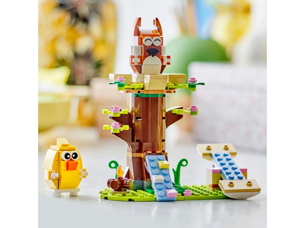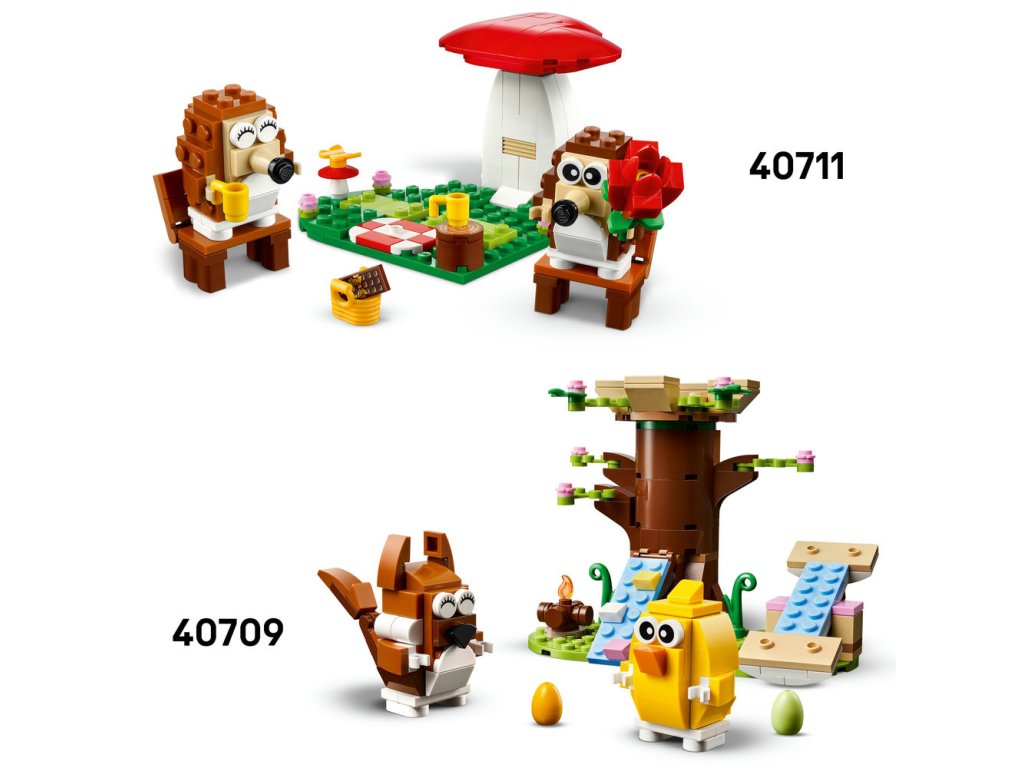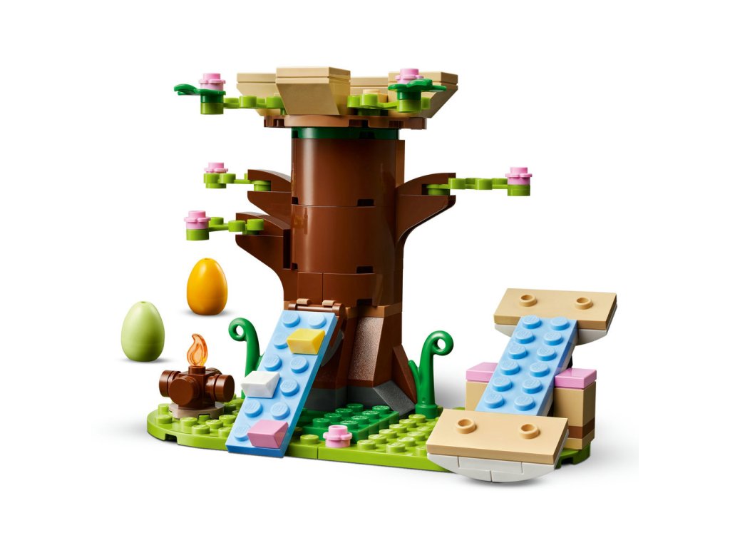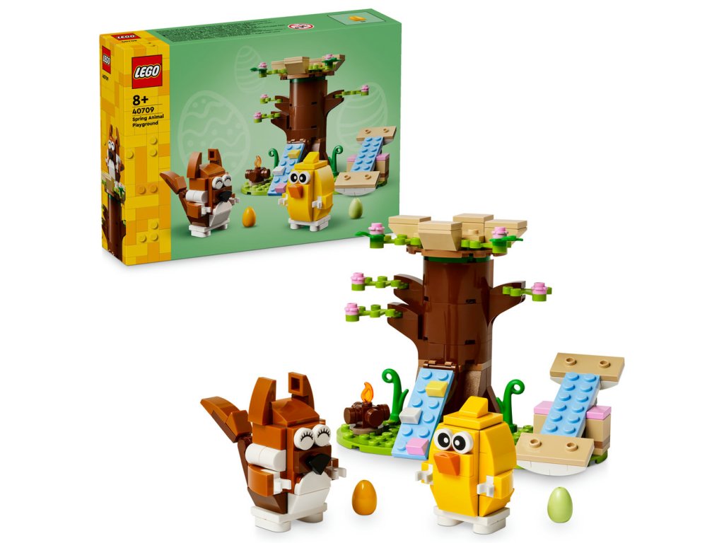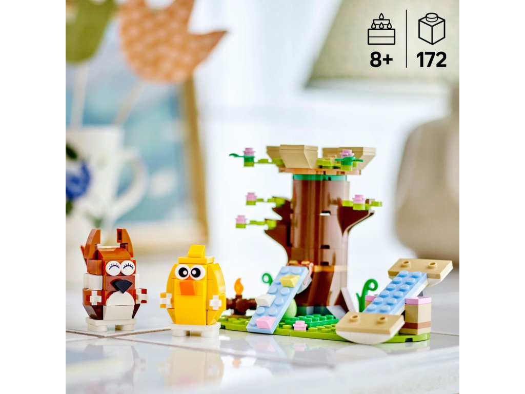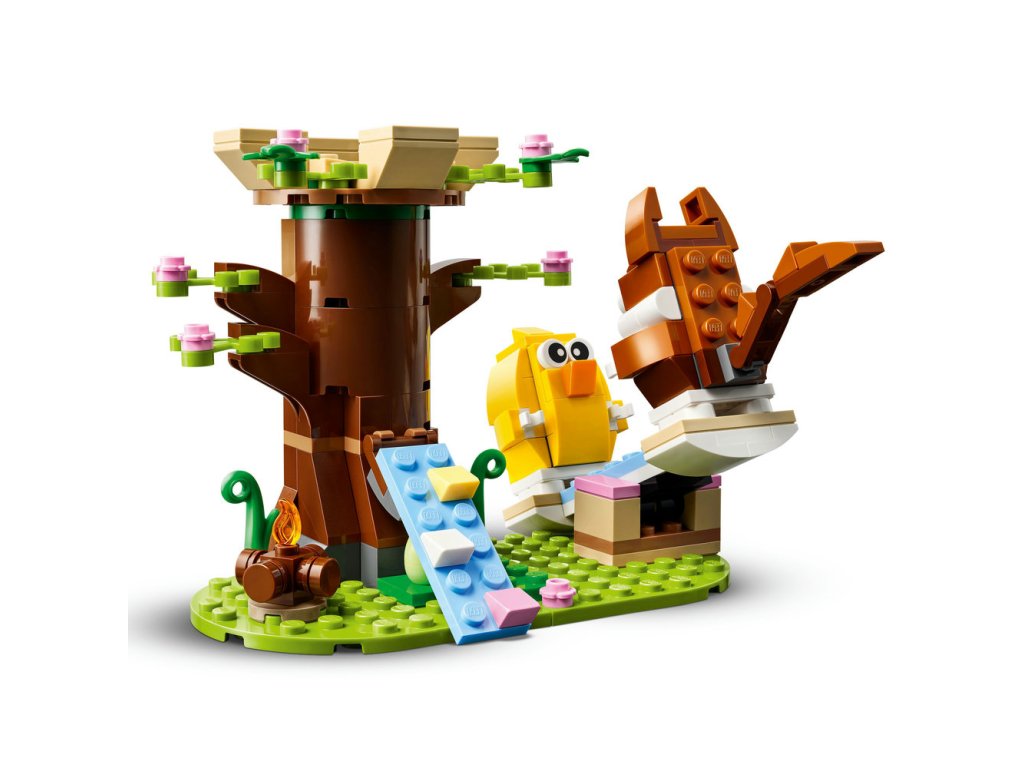 Model Jarné ihrisko pre zvieratká (40709) umožní chlapcom a dievčatám od 8 rokov zinscenovať zábavné príbehy s hračkárskou veveričkou, vtáčikom, domčekom na strome, táborákom, prevažovačkou a dvomi veľkonočnými vajíčkami. Hravé deti môžu vziať veveričku a vtáčika nahor po rampe a posadiť ich na vrchol domčeka na strome, neskôr ich môžu usadiť okolo ohniska a potom ich pohojdať na prevažovačke. K dispozícii sú aj dve farebné veľkonočné vajíčka a miestečka pod rampou alebo za domčekom na strome na zábavnú schovávačku. Táto farebná stavebnica LEGO bude skvelým jarným či veľkonočným darčekom a môžete ju pridať k ďalším stavebniciam LEGO so zvieratkami(predávané samostatne), s ktorými si deti užijú ešte väčšie dobrodružstvá. A až sa deti dohrajú, model bude vyzerať výborne na poličke či nočnom stolíku.