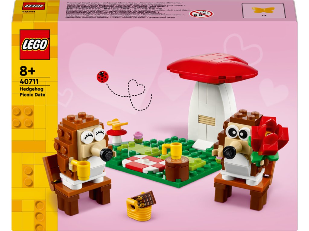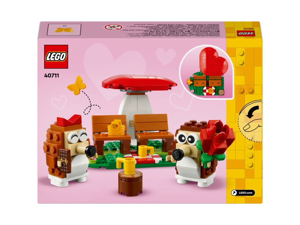 Oslávte akúkoľvek špeciálnu príležitosť s touto roztomilou stavebnicou LEGO® Ježkovia na pikniku (40711) plnou zábavných funkcií. Chlapci a dievčatá od 8 rokov môžu stavať, vystavovať a inscenovať príbehy s touto stavebnicou, ktorá obsahuje dva modely ježkov sediacich pod hubou v tvare srdca na podložke v tvare srdca.