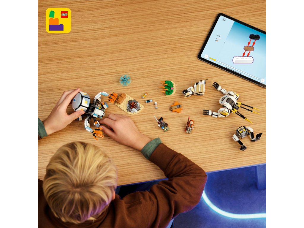 Táto stavebnica založená na videohre Dobrodružstvá LEGO® Horizon a obsahuje 2 minifigúrky: Aloy a jej verného spojenca Varla. Aloy má v rukách luk a Varl nesie kopiju. Každá zbraň obsahuje vylepšenia, ktoré na ne môžete pridať a aktivovať tak útok ohňom, chladom alebo šokom, presne ako vo videohre. Súčasťou balenia sú aj 2 zostaviteľné hračkárske robotické stvorenia. Shell-Walker má pohyblivé nohy a ruky, otváracie pazúry a odnímateľnú nákladnú kapsulu a energetický štít. Plne pohyblivý Sawtooth má otváracie čeľuste, otáčajúci trup a pohyblivý krk, hlavu a nohy. Súčasťou balenia sú aj vysoké trstiny, táborák, truhlica s pokladom a ďalšie doplnky, ktoré inšpirujú k tvorivým hrám na postavy. Stiahnite si aplikáciu LEGO Builder a užite si ešte viac digitálnej zábavy.
