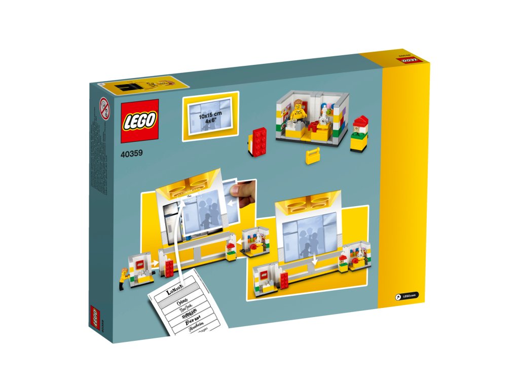 - Obsahuje rámček na obrázok s detailnými prvkami LEGO® obchodu vrátane ikonickej grafiky LEGO kociek, zostaviteľných rekvizít v obchode a samolepiek.