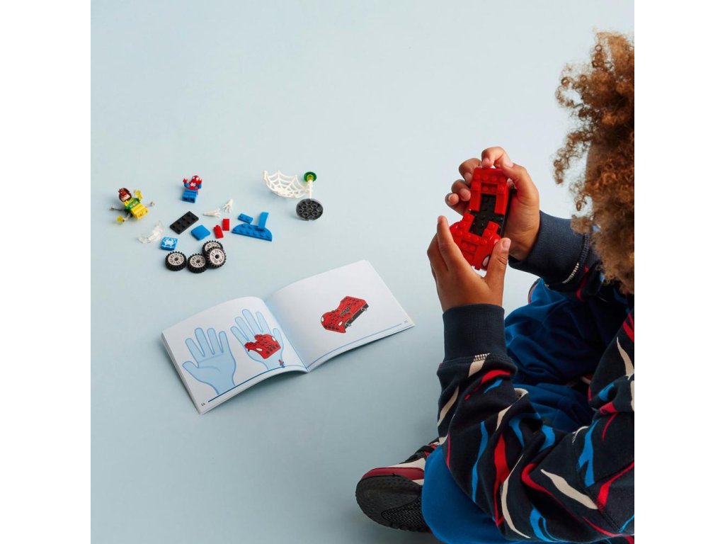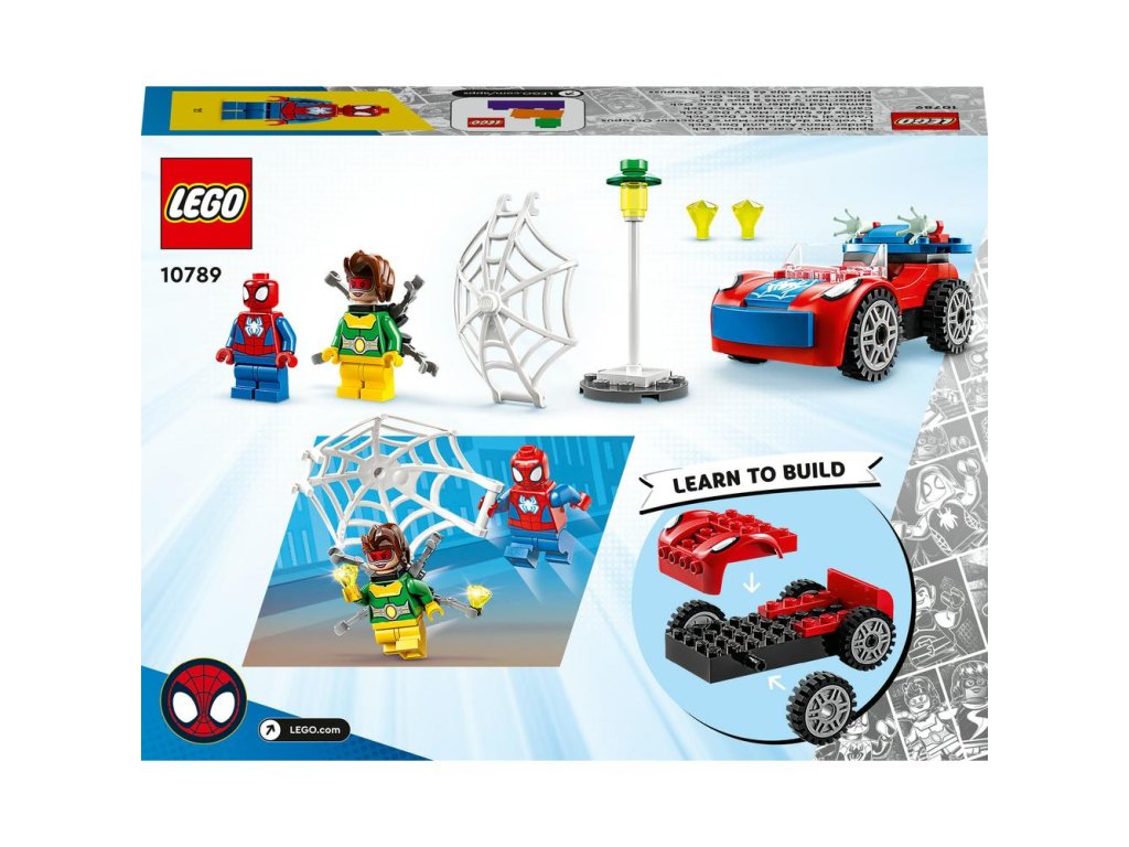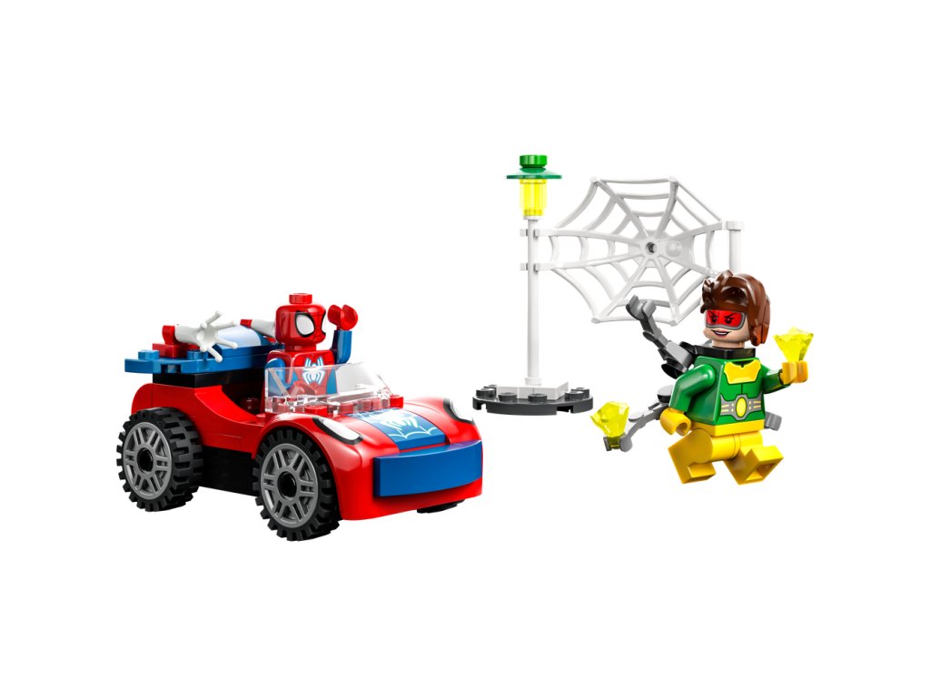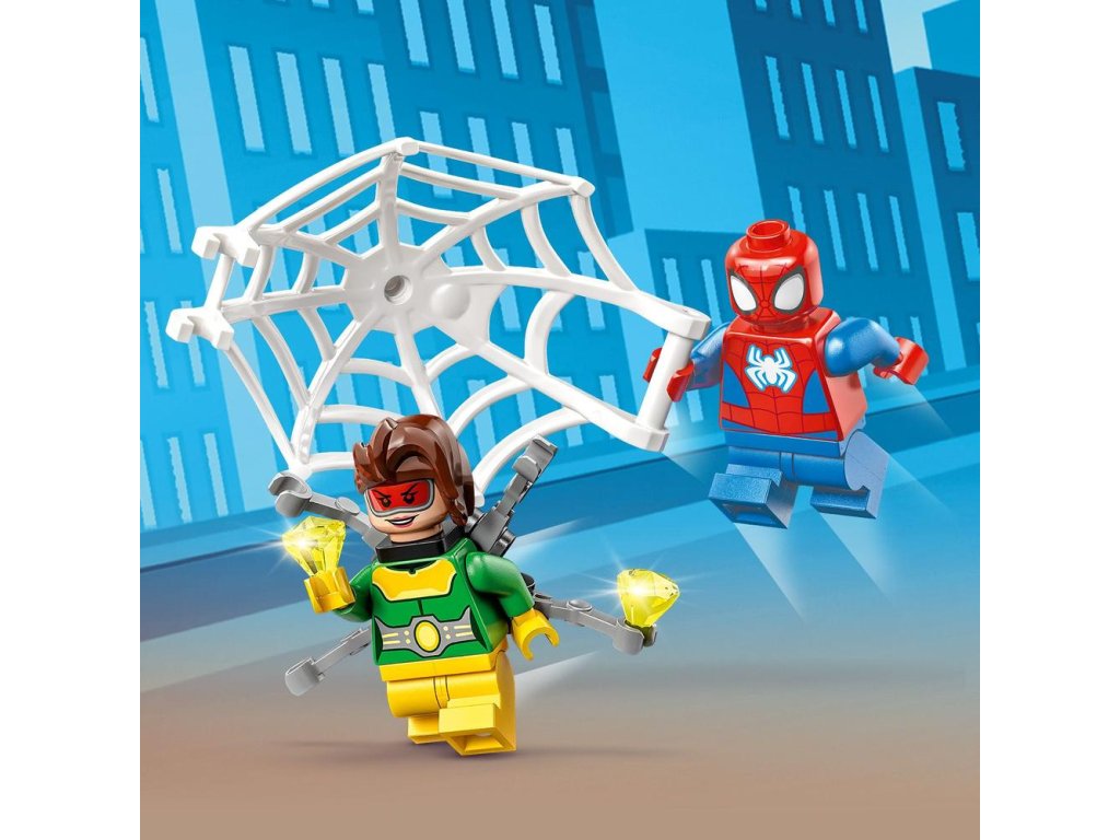 - Ikonické postavy – Stavebnica obsahuje minifigúrky Spideyho a Doc Ocka, Spideyho auto s dvomi prvkami pavučiny, ktoré svietia v tme, a štartovaciu kocku podvozku na podporu začínajúcich staviteľov.
