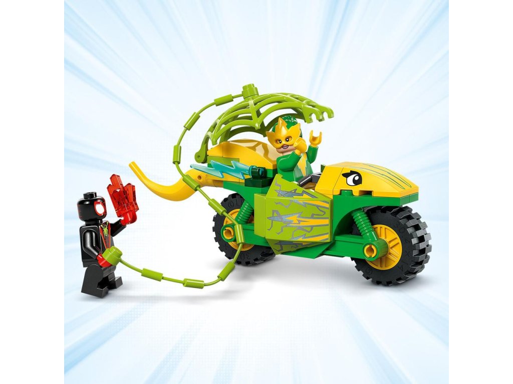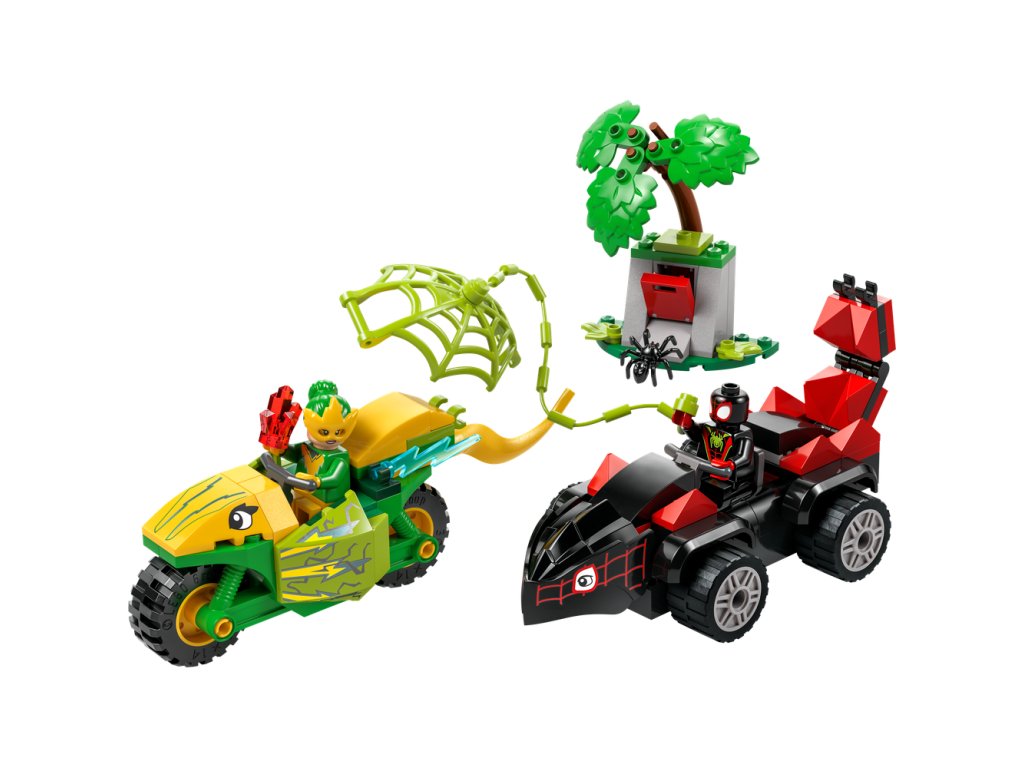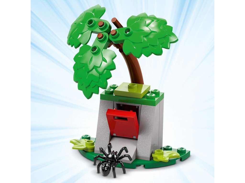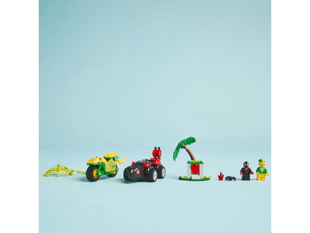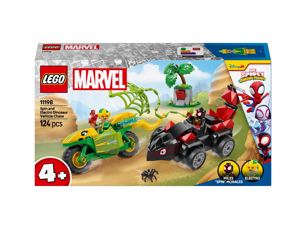Stavebnica stvárňuje akčné scény zo série „Dino-Webs“ z televízneho seriálu Spidey a jeho fantastickí priatelia. Model obsahuje 2 minifigúrky superhrdinov a 2 dinosaurie posuvné autíčka: Milesa „Spina“ Moralesa v stegosaurom aute a Electro na dilophosaurej motorke. Prvok veľkej pavučiny, kryštál ukrytý v skale a doplnky na terénne jazdy inšpirujú deti k tvorivým hrám. Každé vrecúško v balení obsahuje kocky a veľkú štartovaciu kocku na rýchle zostavenie a postavičku, takže sa môžete pustiť rovno do hry. Intuitívny návod nájdete vo forme farebného obrázkového sprievodcu.
