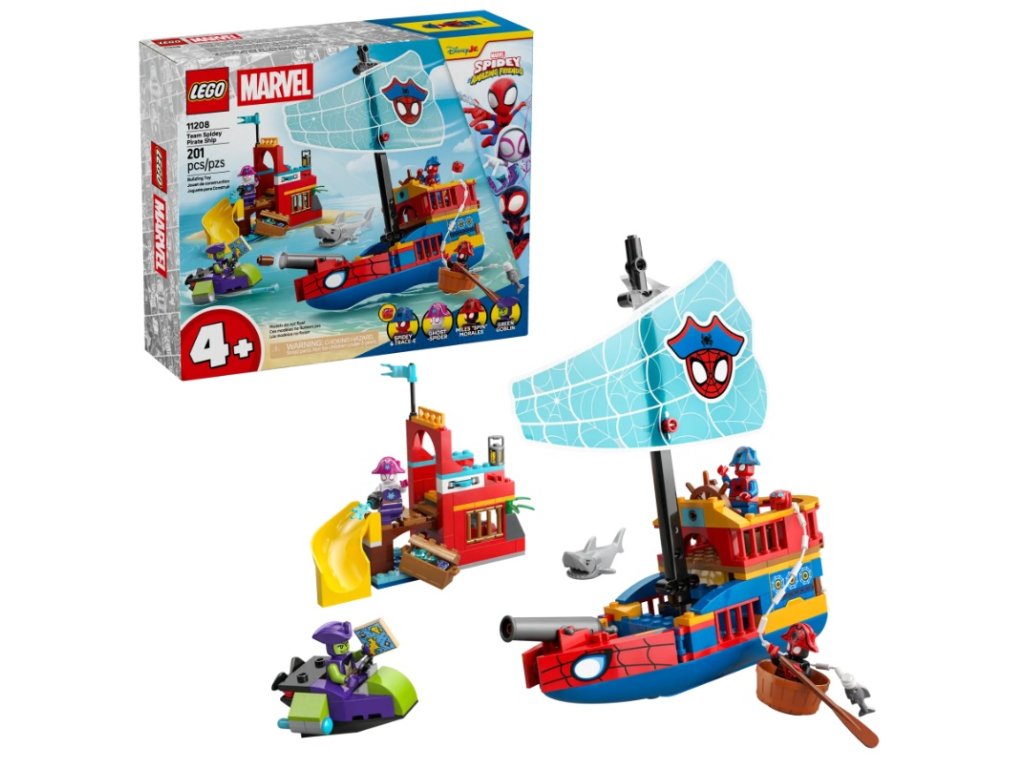 - SUPERHRDINSKÁ PIRÁTSKA LOĎ – Keď Zelený Goblin ukradne truhlicu s pokladom, všetci môžu nastupovať na pavúčiu loď Webs Ahoy v tomto dobrodružstve LEGO® ǀ Marvel Pirátska loď Spideyho tímu (11208) pre chlapcov, dievčatá a deti od 4 rokov