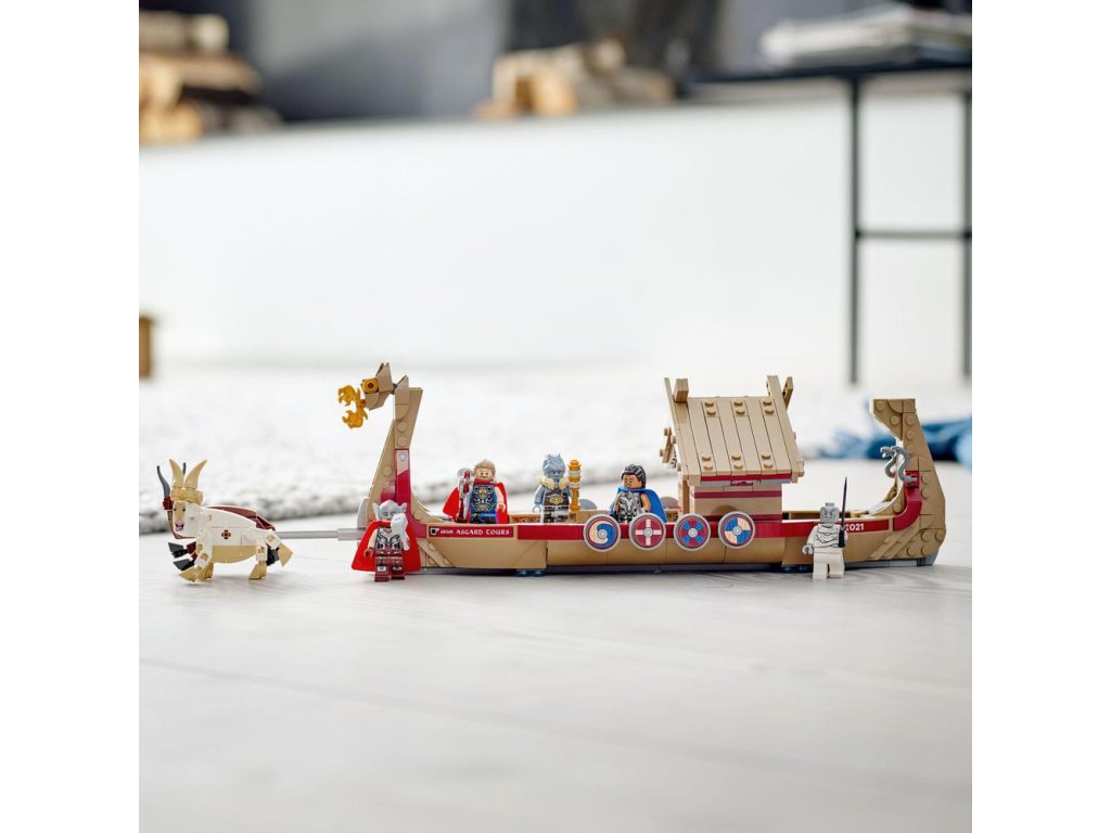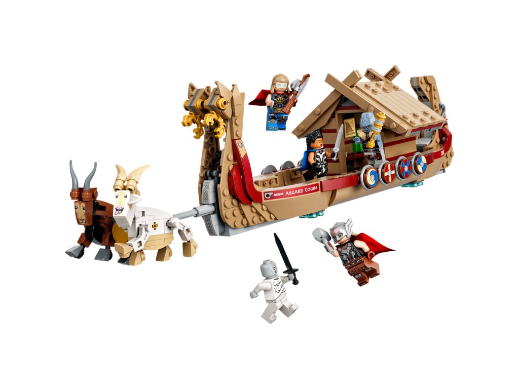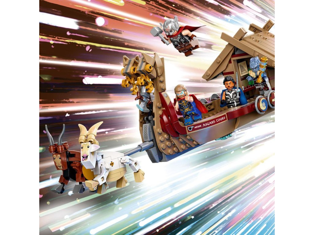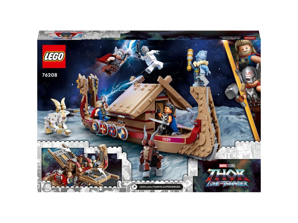 Vďaka vikingskej lodi, ktorá obsahuje ikonické postavičky z marvelovky Thor: Láska a hrom, je stavebnica LEGO® Marvel (76208) Loď s kozím záprahom ideálnym darčekom pre deti od 8 rokov. Bojujte na palube Thorovej lietajúcej lode Dlhú loď ťahajú po oblohe legendárne kozy Toothgnasher a Toothgrinder, ktoré sú zdvihnuté nad zemou, takže deti môžu pri hraní loď ľahko tlačiť. Set obsahuje 5 minifigúrok – Thora, Mocného Thora, Valkýru, Korga a Gorra – a množstvo zbraní a doplnkov vrátane Thorovej elektrickej sekery Strombreaker. Centrálna kabína má otváraciu strechu pre prístup k ďalšiemu hernému priestoru vnútri. Autentické doplnky – vrátane lodného hasáku, hasiaceho prístroja, mapy Nového Asgardu, fľaše a kryštálu slnečného kameňa, ktoré ďalej podnietia nápaditú hru. Keď je superhrdinským dobrodružstvám koniec, deti si môžu loď vystaviť vo svojej izbičke. Pre ešte viac staviteľskej zábavy bezplatná aplikáci
