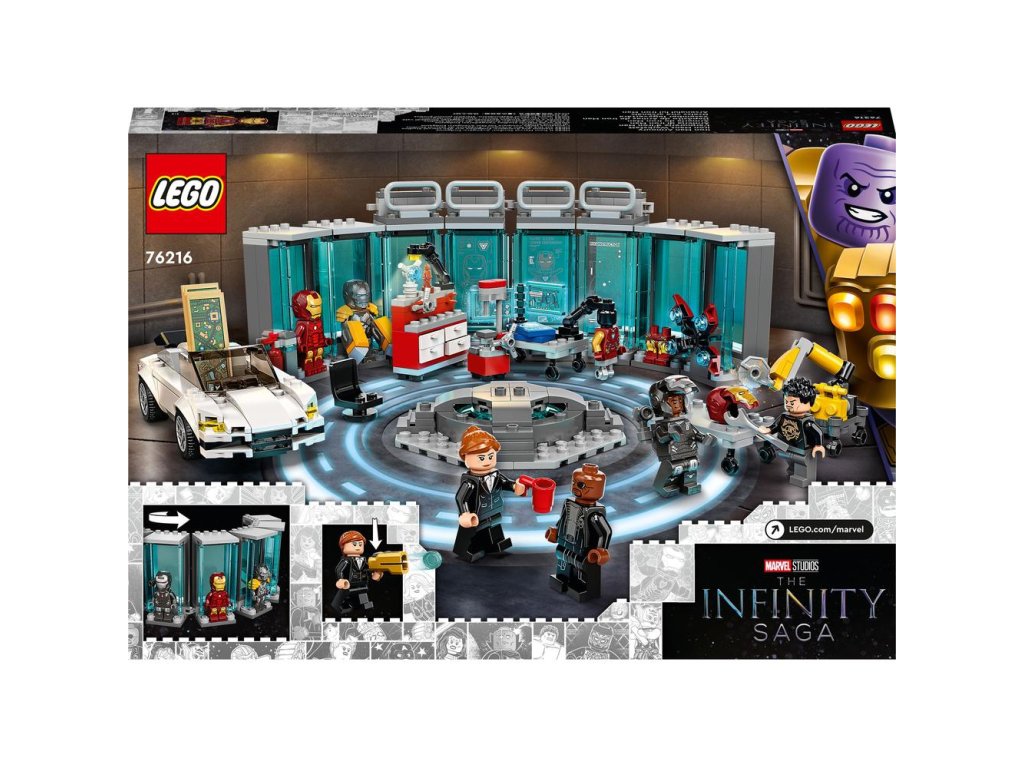 - Iron Manova základňa – Zložte poctu Ságe nekonečna od Marvel Studios so stavebnicou LEGO® Marvel Zbrojnica Iron Mana (76216), ktorá je plná autentických detailov, prvkov a minifigúrok
