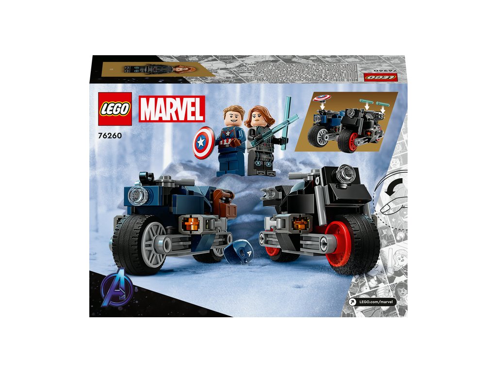 - Superhrdinovia na motorkách – Stavebnica obsahuje minifigúrky Captain Americu a Black Widow, slávny štít, obušky a 2 zostaviteľné motorky