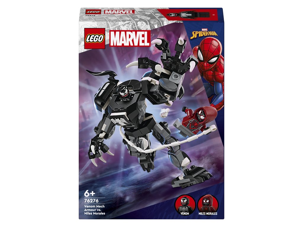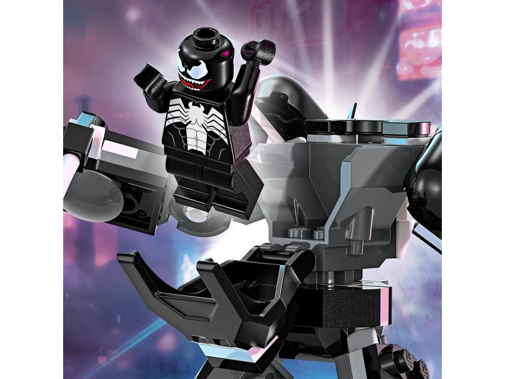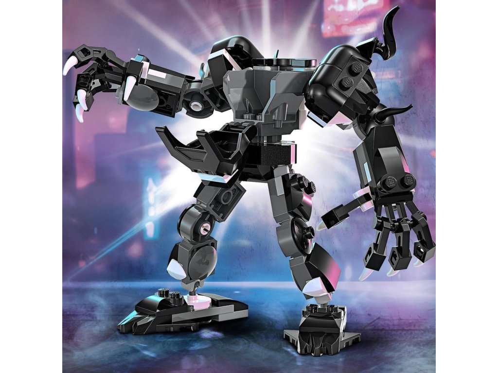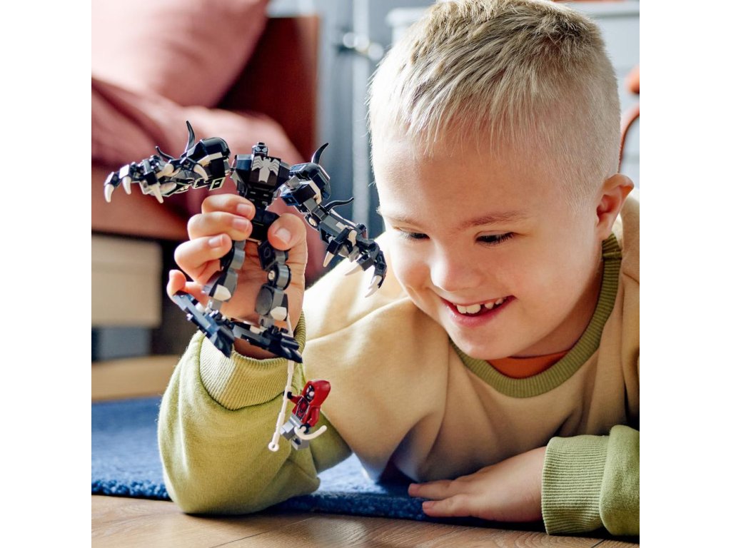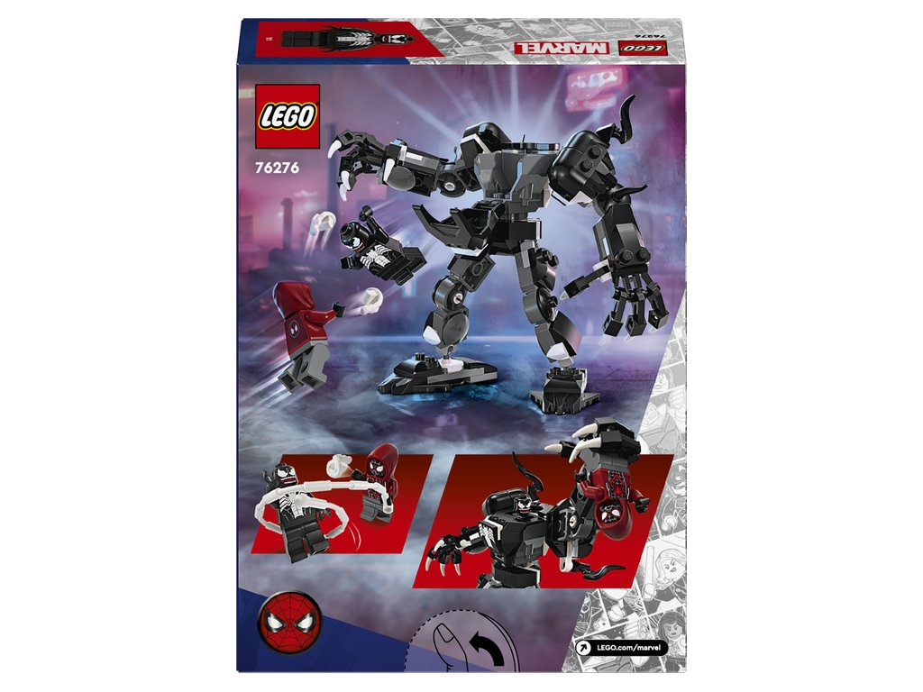 Zostaviteľný a polohovateľný hračkársky Venom v robotickom brnení má kĺbové ruky, nohy a ruky s pazúrmi, ktoré sú veľmi veľké na to, aby sa do nich zmestila minifigúrka. Jeho hrudník umožňuje a odkryť kokpit pre minigúrku pilota Venoma. Stavebnica obsahuje aj minifigúrku Milesa Moralesa, ktorý nesie 2 ručné vystreľovače pavučín a ohybné pavučinové „lano“, ktoré možno pripojiť k zostavenému Venoma v robotickom obleku na viacerých miestach. LEGO Marvel (predávané samostatne).Pre väčšiu digitálnu zábavu môžu približovať a otáčať modely v 3D a sledovať pokrok pomocou zábavnej, intuitívnej aplikácie LEGO Builder.