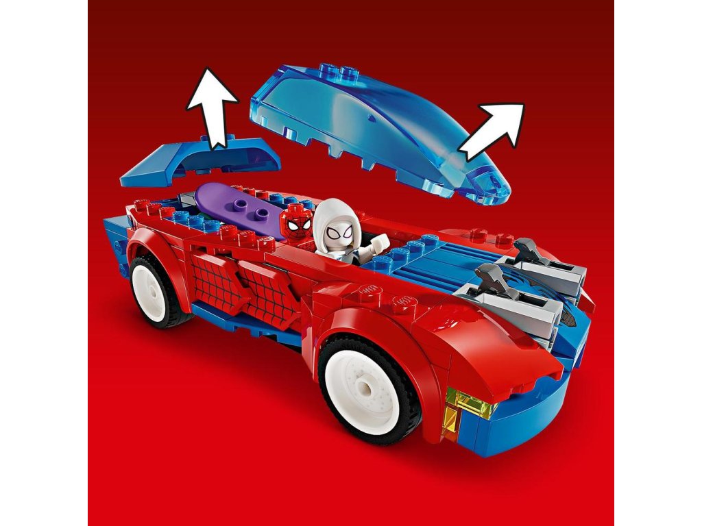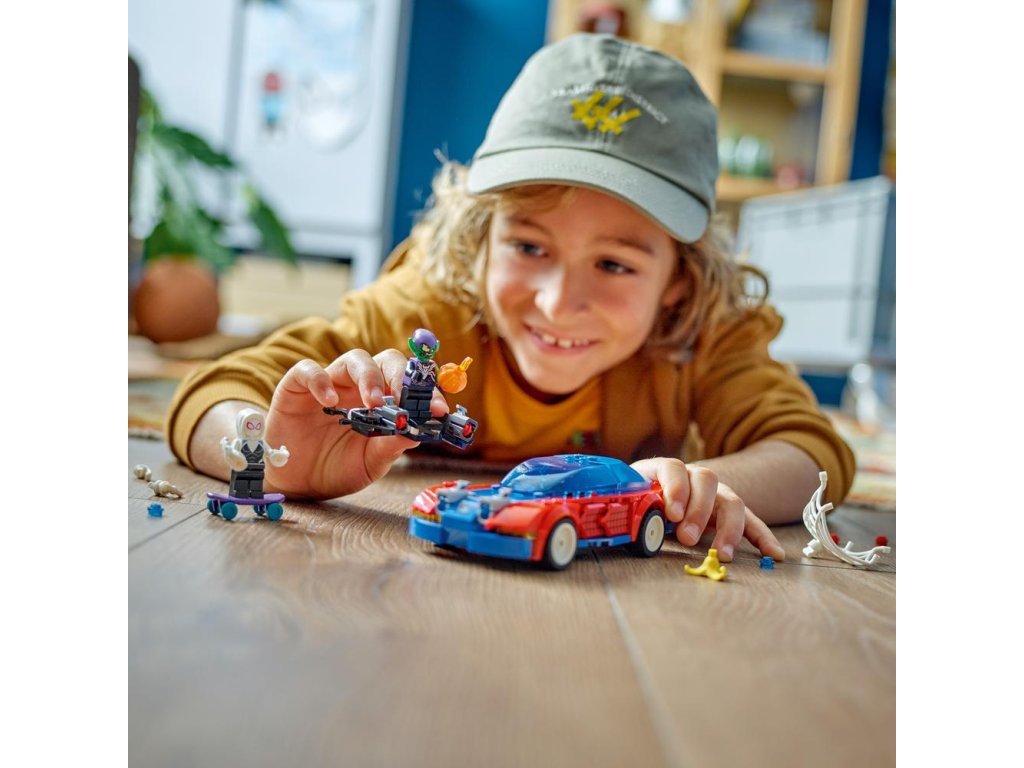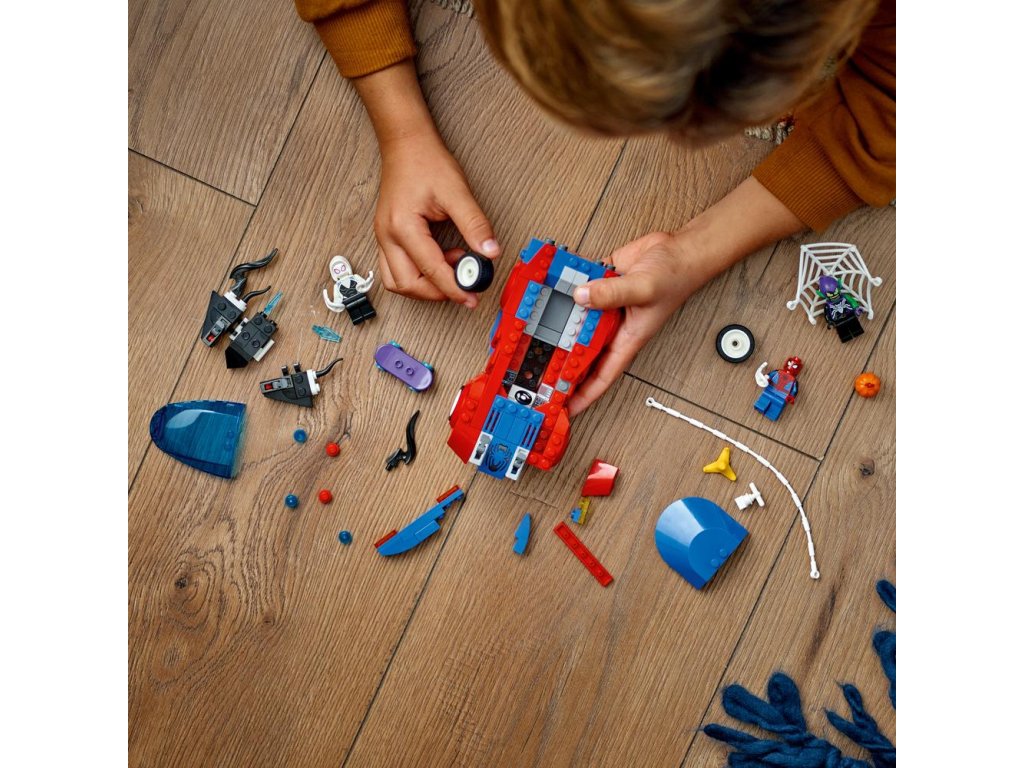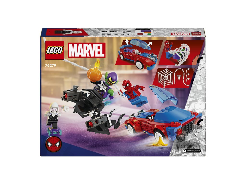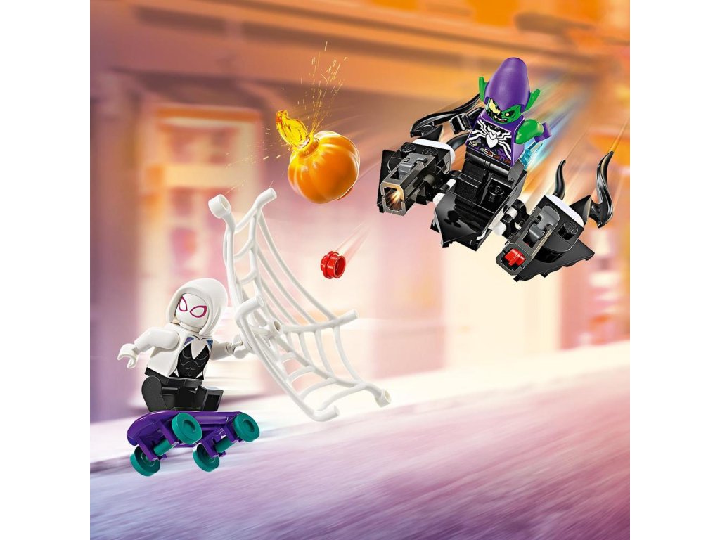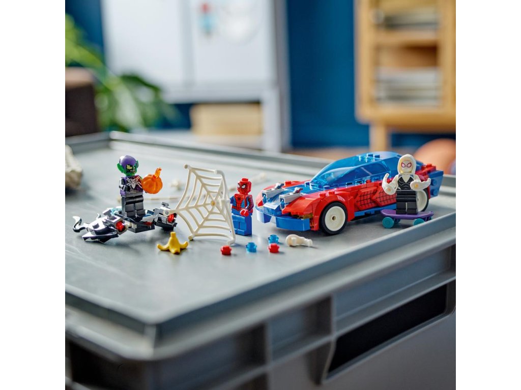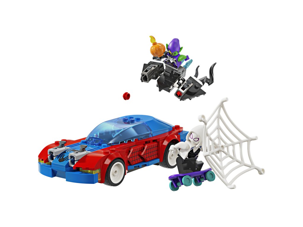 Spider-Man, Ghost-Spider a Venomov Zelený goblin sa zapoja do bojovej akcie a použijú úžasný sortiment vozidiel, zbraní a doplnkov. Spider-Manovo auto má 2 predné vystreľovače projektilov, klzák Zeleného goblina má 2 vystreľovače projektilov a tekvicové bomby a Ghost-Spider používa 2 ručné odpaľovače pavučiny počas jazdy na svojom skateboarde. Spider-Man sa hojdá na pružnom pavučinovom „lane“ a na chytanie zloduchov využíva veľkú ohýbateľnú pavučinu. Odnímateľné časti vám umožní prístup do interiéru auta, ktorý je dostatočne veľký na 2 minifigúrky a skateboard. Pre väčšiu digitálnu zábavu si staviteľ môže približovať a otáčať modely v 3D zobrazeniach a sledovať svoj postup pomocou zábavnej, intuitívnej aplikácie LEGO Builder.