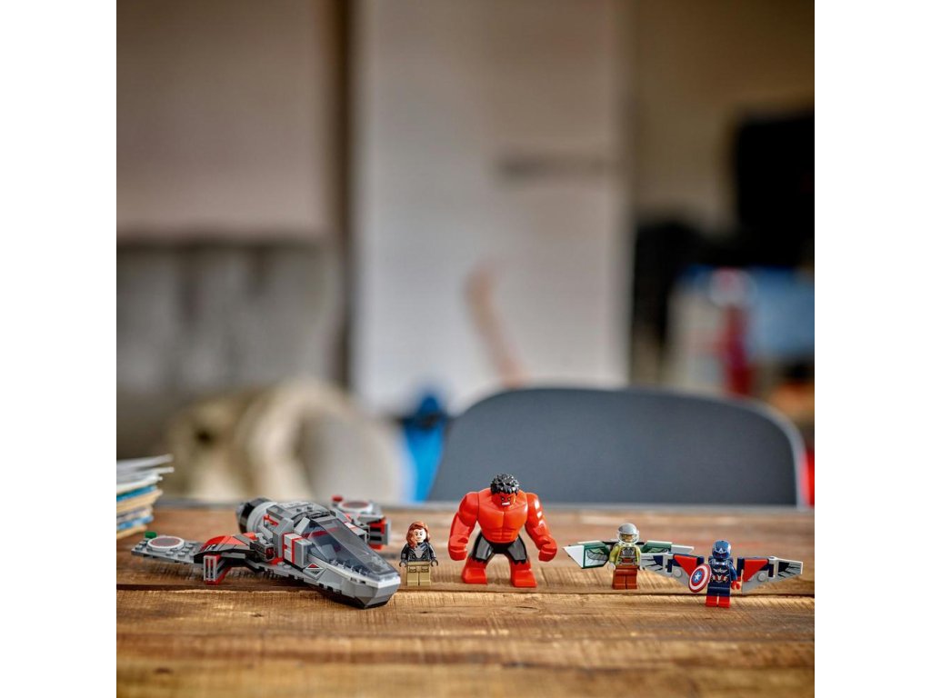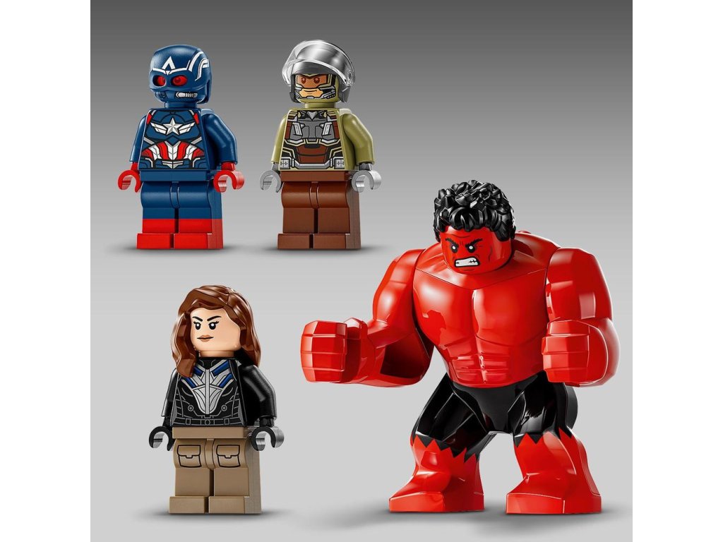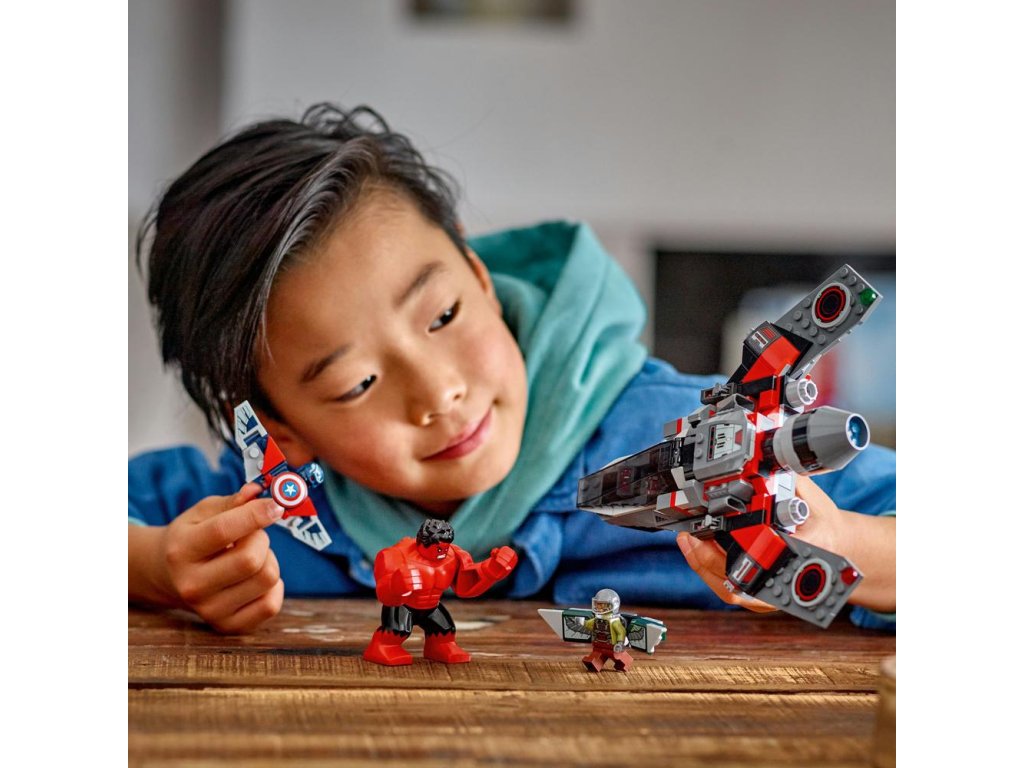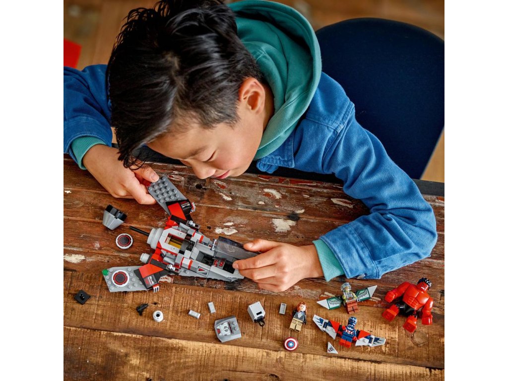 Táto zostaviteľná hračkárska stíhačka obsahuje pôsobivú zostavu minifigúrok: Kapitána Amerika a Falcona (obaja majú roztváracie krídla), Red Hulka a Ruth Bat-Seraph. Stíhačka má veľký otvárací kokpit s priestorom pre minifigúrku pilota. Deti ju môžu ľahko držať, lietať s ňou a útočiť pomocou 2 priložených vystreľovačov projektilov. Vrchnú časť stíhačky možno nadvihnúť a odhaliť tak skrytý úložný priestor v zadnej časti s miestom na náhradné projektily či tajomné kovy. Toto zostaviteľné hračkárske vozidlo je ideálne na samostatnú hru na postavy. Pre väčšiu digitálnu zábavu si deti môžu model priblížiť, otáčať ho v 3D rozhraní a sledovať svoj staviteľský pokrok pomocou zábavnej a intuitívnej aplikácie LEGO Builder.