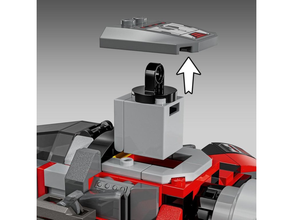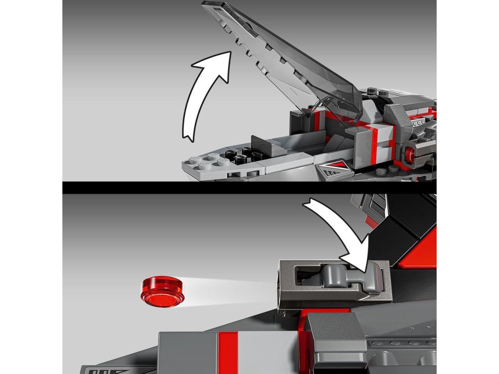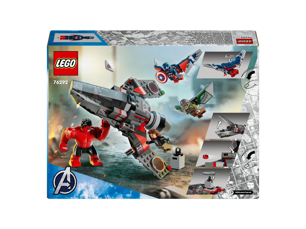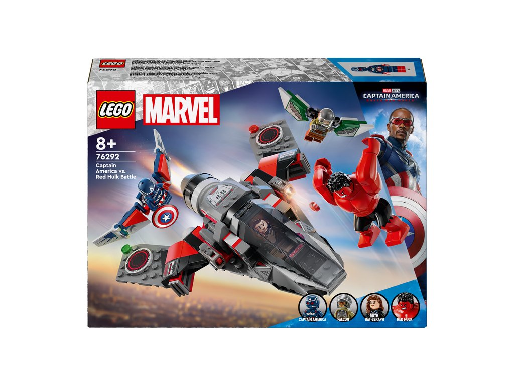 Táto zostaviteľná hračkárska stíhačka obsahuje pôsobivú zostavu minifigúrok: Kapitána Amerika a Falcona (obaja majú roztváracie krídla), Red Hulka a Ruth Bat-Seraph. Stíhačka má veľký otvárací kokpit s priestorom pre minifigúrku pilota. Deti ju môžu ľahko držať, lietať s ňou a útočiť pomocou 2 priložených vystreľovačov projektilov. Vrchnú časť stíhačky možno nadvihnúť a odhaliť tak skrytý úložný priestor v zadnej časti s miestom na náhradné projektily či tajomné kovy. Toto zostaviteľné hračkárske vozidlo je ideálne na samostatnú hru na postavy. Pre väčšiu digitálnu zábavu si deti môžu model priblížiť, otáčať ho v 3D rozhraní a sledovať svoj staviteľský pokrok pomocou zábavnej a intuitívnej aplikácie LEGO Builder.