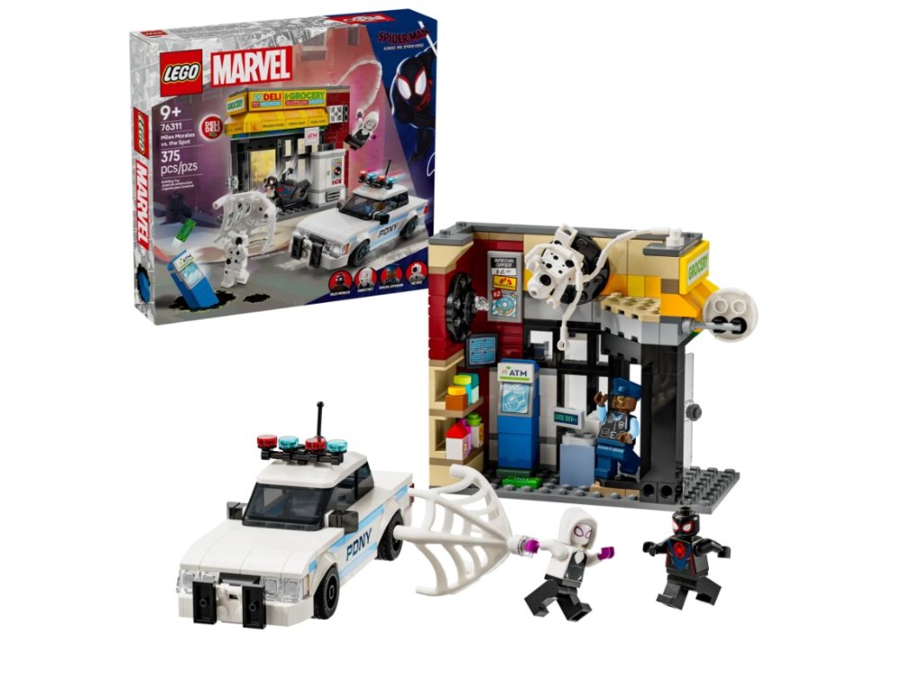 Spider-Man stavebnica obsahuje 4 minifigúrky: Milesa Moralesa, Škvrnu, Gwen Stacyovú a strážnika Jeffersona. Večierka má stenu s funkciou výbuchu, čo umožní odstrán enie bankomatu. Medzi doplnky patrí dlhé, pružné pavučinové lano a flexibilná pavučina, ktorá je dostatočne veľká na to, aby ulapila celú minifigúrku. Otvorte policajné auto a vložte doň 2 minifigúrky. Ešte viac digitálnej zábavy si stavitelia užijú pomocou zábavnej a intuitívnej aplikácie LEGO Builder, v ktorej si môžu približovať a otáčať modely v 3D a sledovať svoj pokrok.