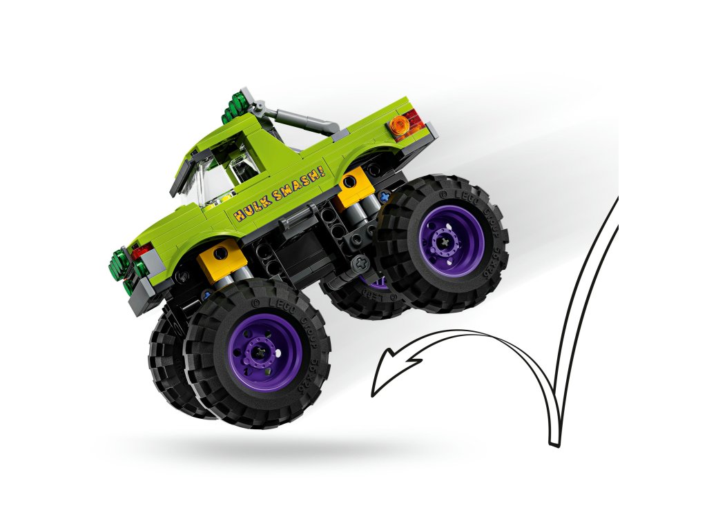 - Zostaviteľné terénne nákladné auto – Robustný truck superhrdinu má sedadlo vodiča s priestorom pre minifigúrku Hulka a veľké pohyblivé kolesá s odpružením, ktoré tlmí nárazy
