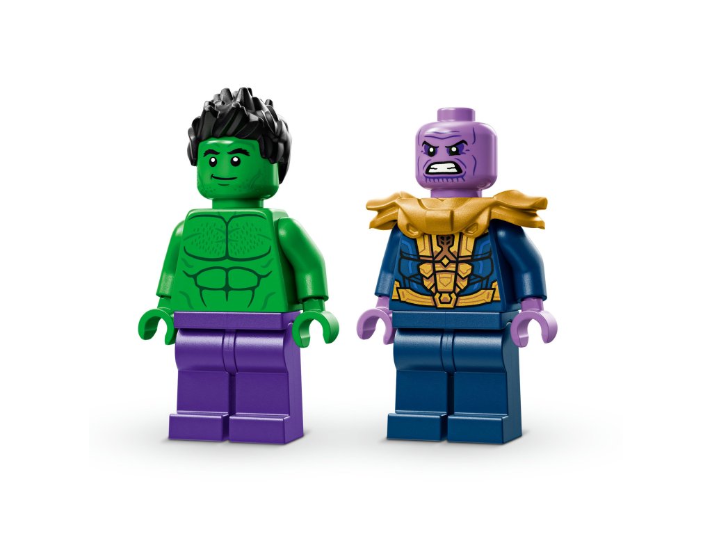 - Minifigúrky LEGO® ǀ Marvel – Stavebnica obsahuje minifigúrku Hulka s odnímateľnou prilbou a minifigúrku Thanosa s Teseraktom a Rukavicou nekonečna