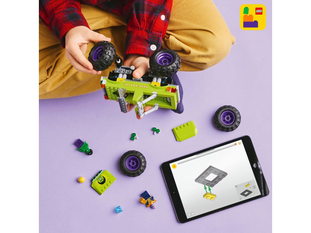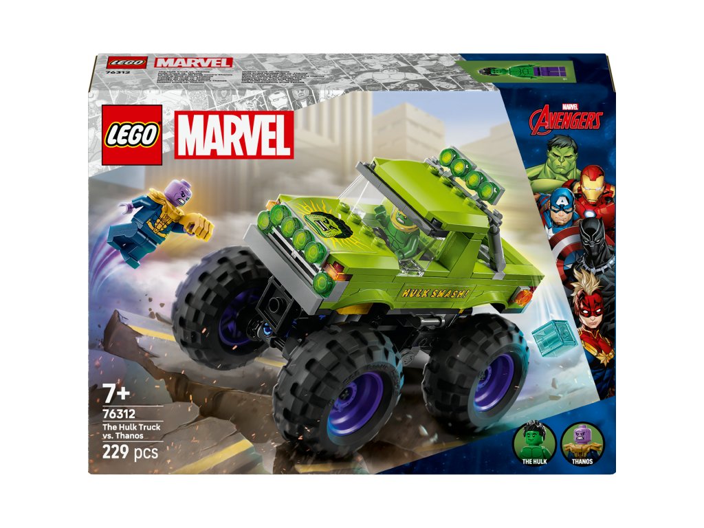 Hulkov truck vs. Thanos (76312) je zostaviteľná stavebnica LEGO® ǀ Marvel, ktorá obsahuje Hulkovo výkonné nákladné auto a 2 minifigúrky superhrdinov. Tento kvalitný darček pre chlapcov a dievčatá od 7 rokov je ideálny pre malých fanúšikov filmov o Avengeroch od Marvelu, veľkých truckov a dobrodružstiev so stavebnicami LEGO. Výkonný truck LEGO ǀ Marvel obsahuje minifigúrku Hulka s odnímateľnou prilbou a minifigúrku Thanosa s Teseraktom a Rukavicou nekonečna. Truck superhrdinu má zdvíhaciu kabínu, vďaka ktorej sa dostane na sedadlo vodiča, a priestor pre minifigúrku Hulka. Na vonkajšej zelenej strane nájdete nápis „Hulk Smash!“ a ozdoby v podobe Hulkovej tváre. Vďaka veľkým pohyblivým kolesám, robustnej konštrukcii a odpruženiu, ktoré tlmí nárazy zvládne tento megatruck aj tie najnáročnejšie misie. Ešte viac digitálnej zábavy si stavitelia užijú vďaka intuitívnej aplikácii LEGO Builder.