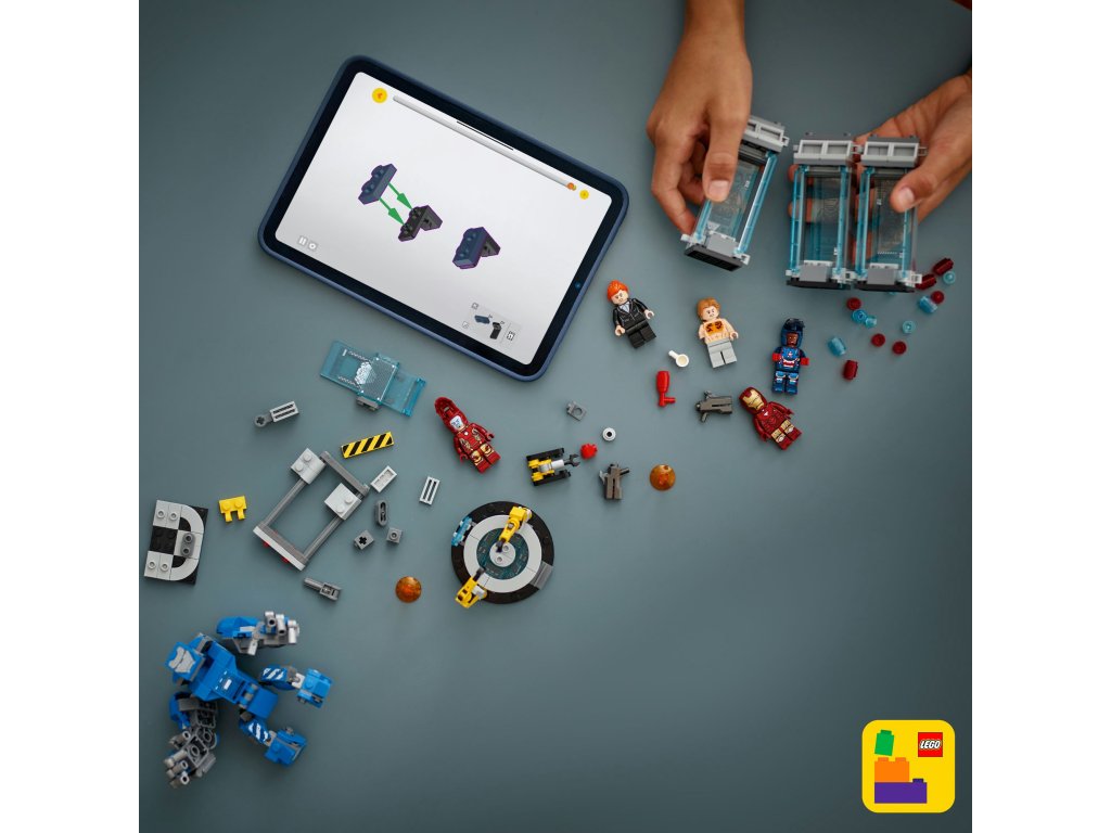 - Postavy superhrdinov – Brnenie Iron Mana MK1, MK43 a MK6, minifigúrky Pepper Pottsovej a Aldricha Killiana, zostaviteľný robot Dum-E a robot MK3 s pohyblivými rukami a nohami a otváracím kokpitom