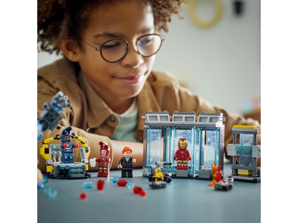 - Iron Manovo laboratórium s figúrkami LEGO® ǀ Marvel – Iron Man a jeho laboratórium: Sieň brnenia je stavebnica s Avengermi na hranie a vystavenie pre chlapcov a dievčatá od 8 rokov