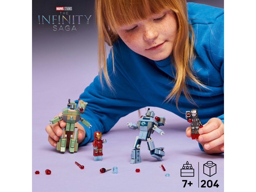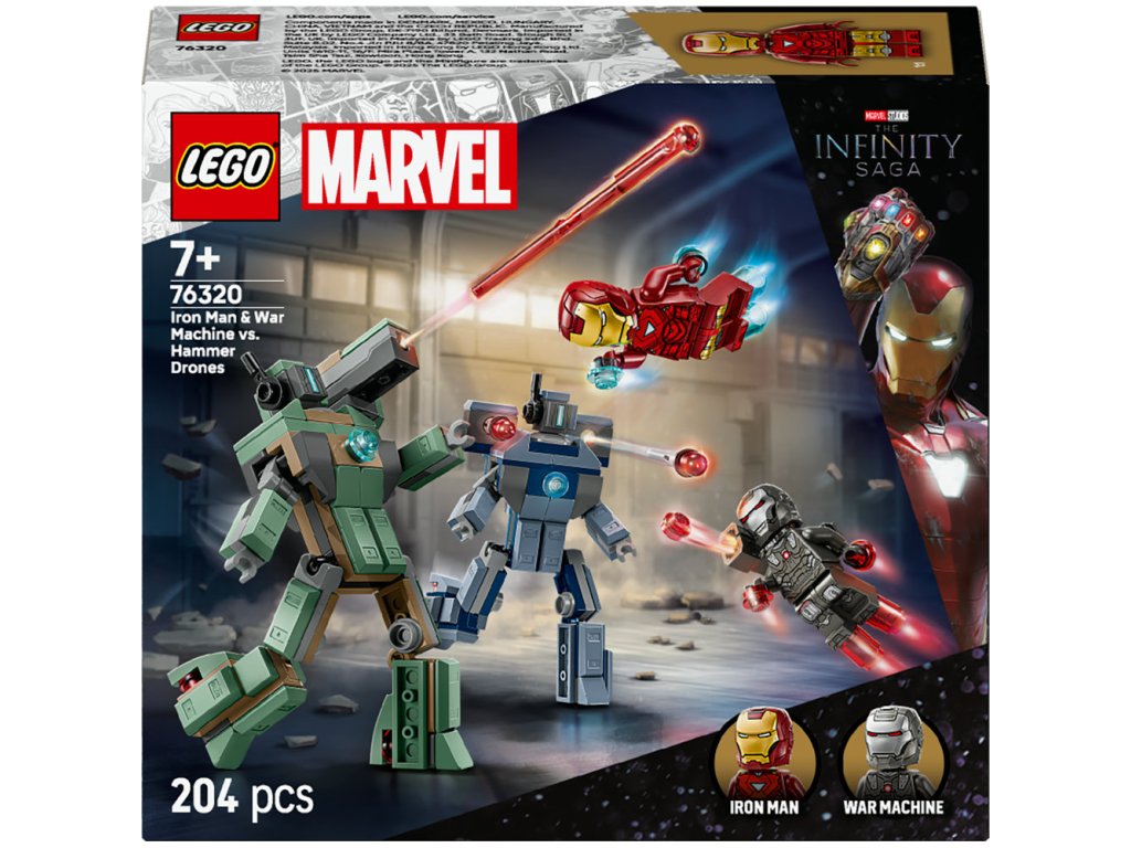 Táto zostaviteľná hračka pripomína epickú bojovú scénu z filmu Iron Man 2 od štúdia Marvel a obsahuje minifigúrky Iron Mana, War Machine a 2 zostaviteľné Hammerove Drony. Hammerove Drony sú plne kĺbové, takže deti ich môžu nastaviť do rôznych dynamických póz. Zelený Hammerov Dron má na ramene pružinový vystreľovač a modrý Hammerov Dron má na oboch ramenách vystreľovače aktivované stlačením. War Machine má červené blastery na rukách a nohách a na ramene má vystreľovač projektilov. Iron Man má modré blastery na rukách a nohách a môže držať prvky laserových lúčov. Ešte viac digitálnej zábavy čaká staviteľov vďaka intuitívnej aplikácii LEGO Builder, kde si môžu približovať a otáčať modely v 3D a sledovať svoj pokrok. Model obsahuje 204 dielikov.