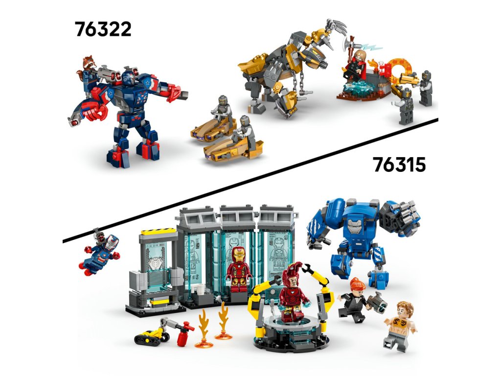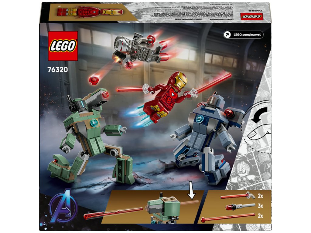 - Minifigúrky LEGO® ǀ Marvel – Súčasťou je minifigúrka Iron Mana s modrými blastermi na rukách a nohách a zbraňami s laserovými lúčmi a minifigúrku War Machine s červenými blastermi na rukách a nohách a vystreľovačom projektilov